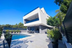 We are offering for sale an exceptional modern villa situated directly on the seafront in a quiet Dalmatian bay. This unique property represents the perfect combination of luxury, comfort, and privacy—with direct access to the beach and the daily sound of ocean waves in the background. The surroundings are complemented by Mediterranean plants, oleanders, and ornamental trees, creating an aromatic and visually impressive oasis of calm. The property includes private parking for several cars, a 6×4-meter outdoor pool, a spacious sunbathing area, a relaxation lounge area, and a grassy terrace with panoramic sea views.