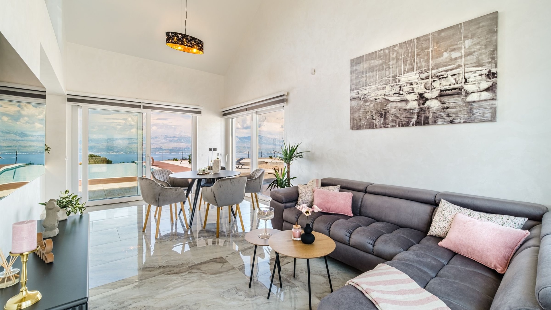 The outdoor area, with a total area of 1,200 m², is completely fenced and carefully maintained. There is an infinity pool with an area of 44 m², complemented by a whirlpool. The courtyard also has parking spaces for two vehicles. In front of the villa is a large olive grove with an area of 3,499 m².