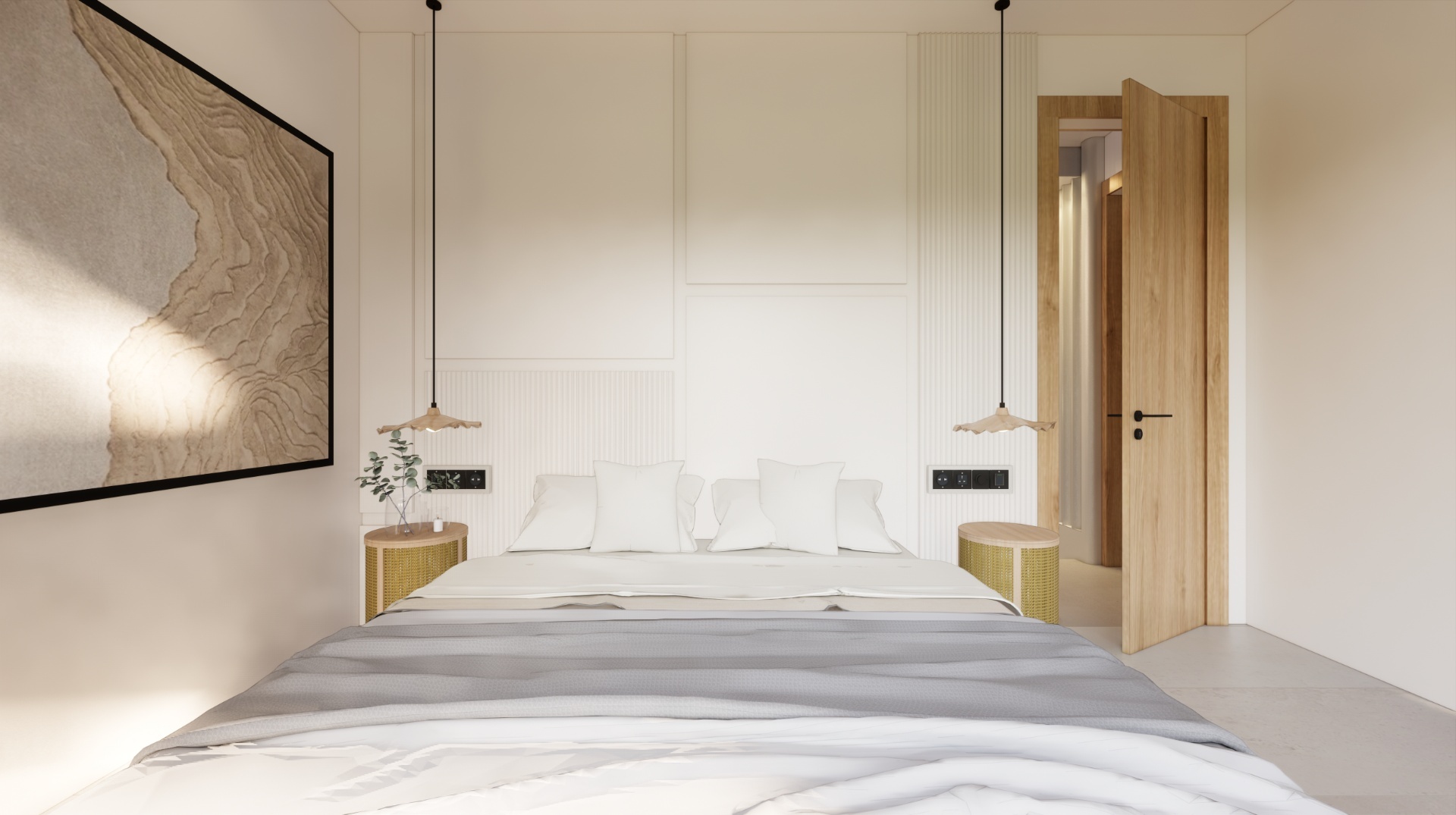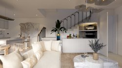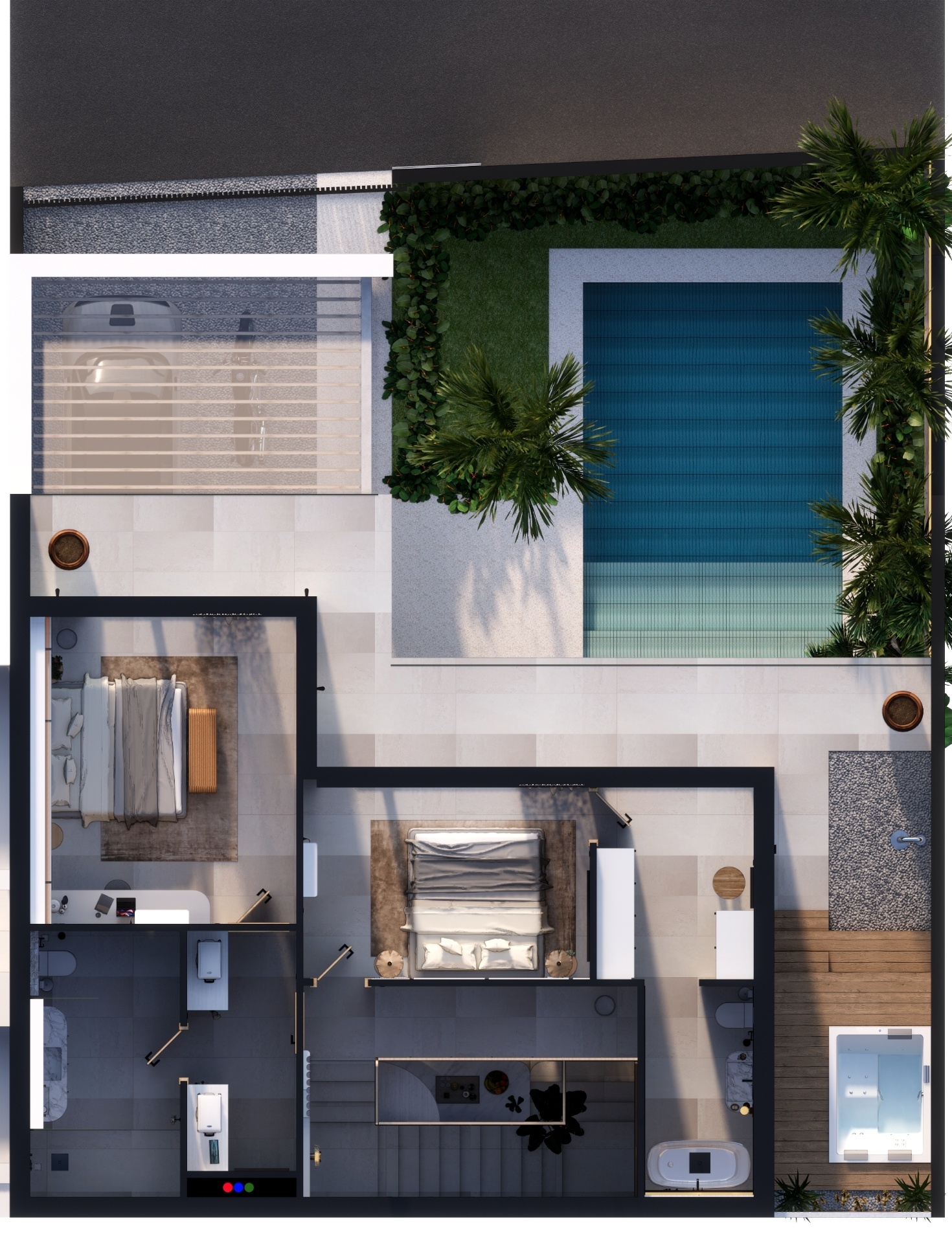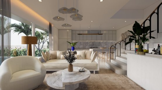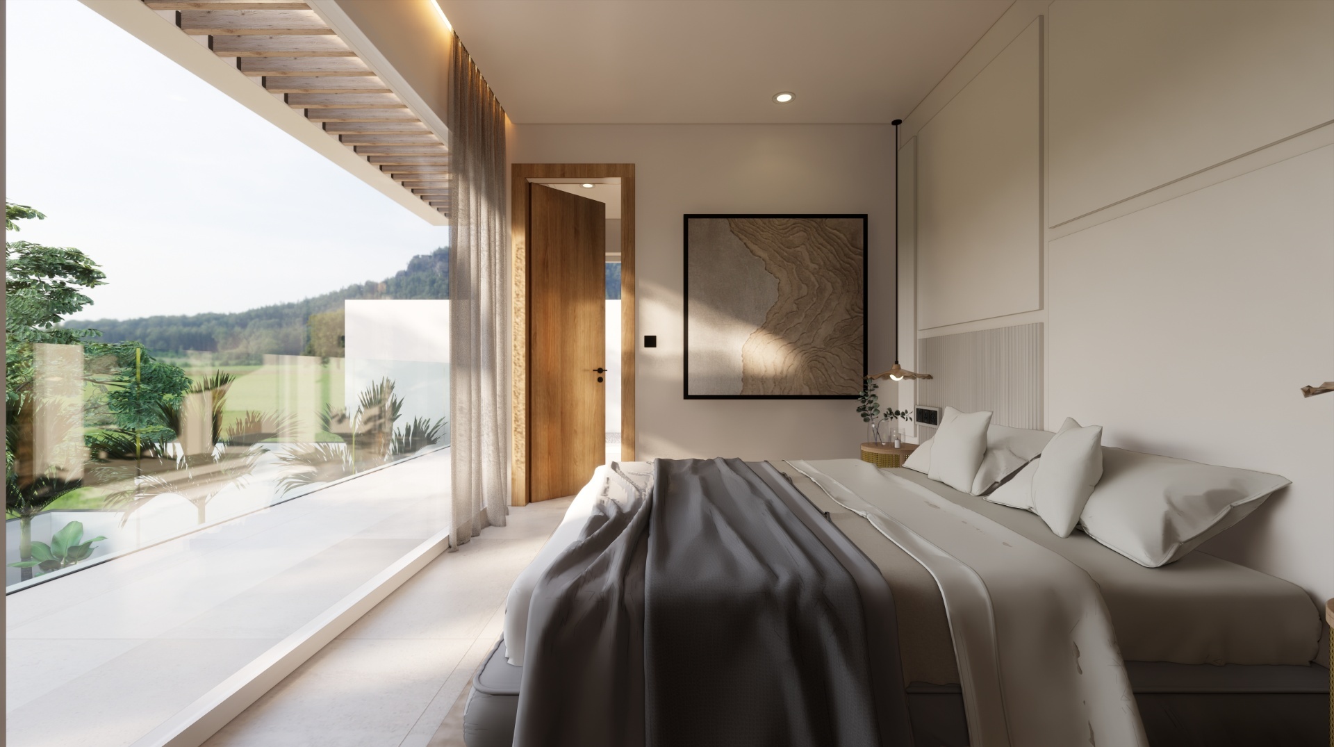 The layout offers three bedrooms with en-suite bathrooms, a kitchen with luminous interior furnishings, excellent quality and elegant design, an interconnected living area with stunning views thanks to French windows that provide natural lighting to the space. The cosiness of the space is beautifully complemented by the sunken sofa with fireplace. Every detail has its reason and is enhanced by the sensitively selected materials of unique design, as everything was made specifically for this project.