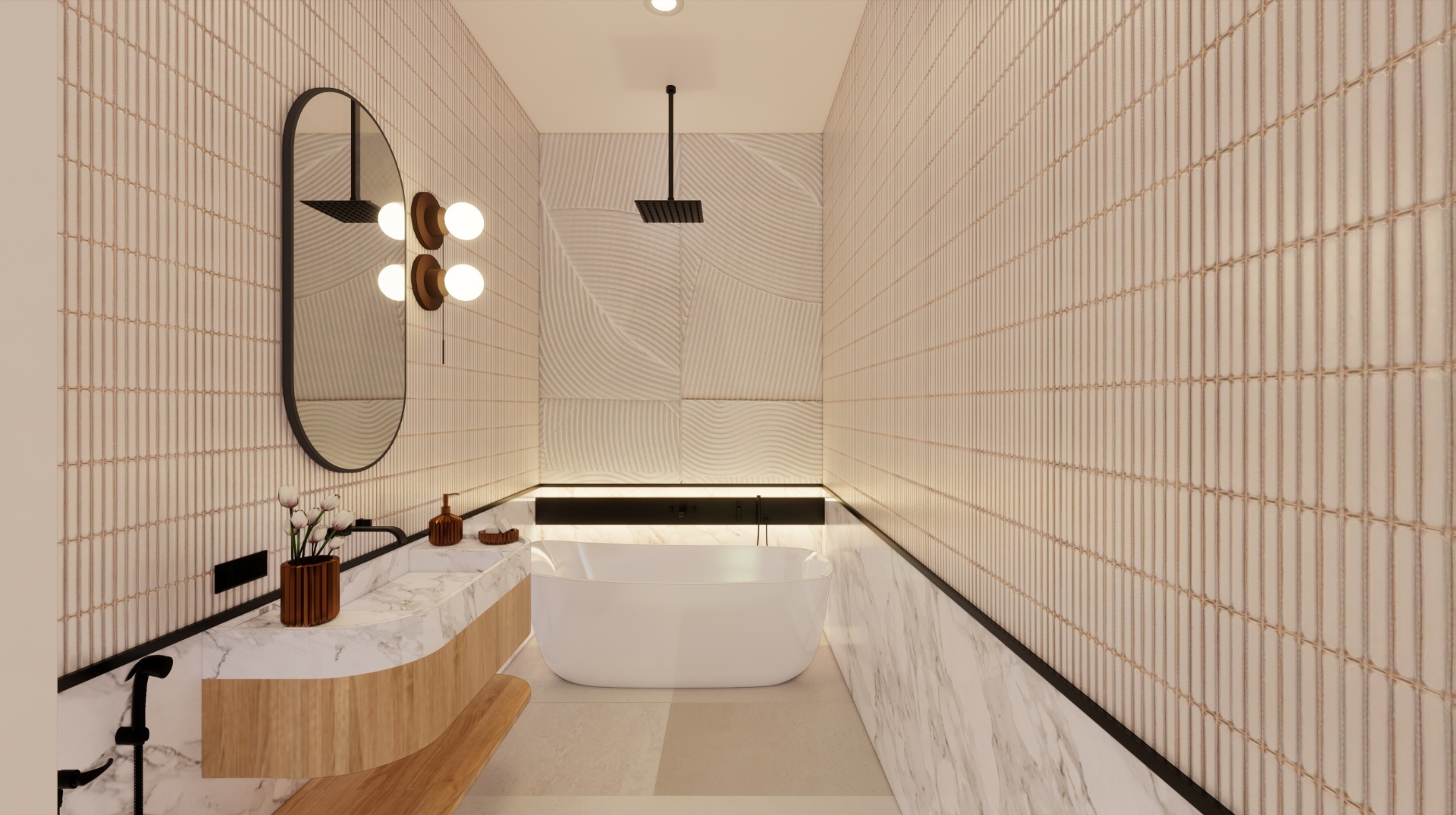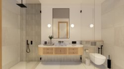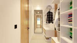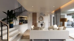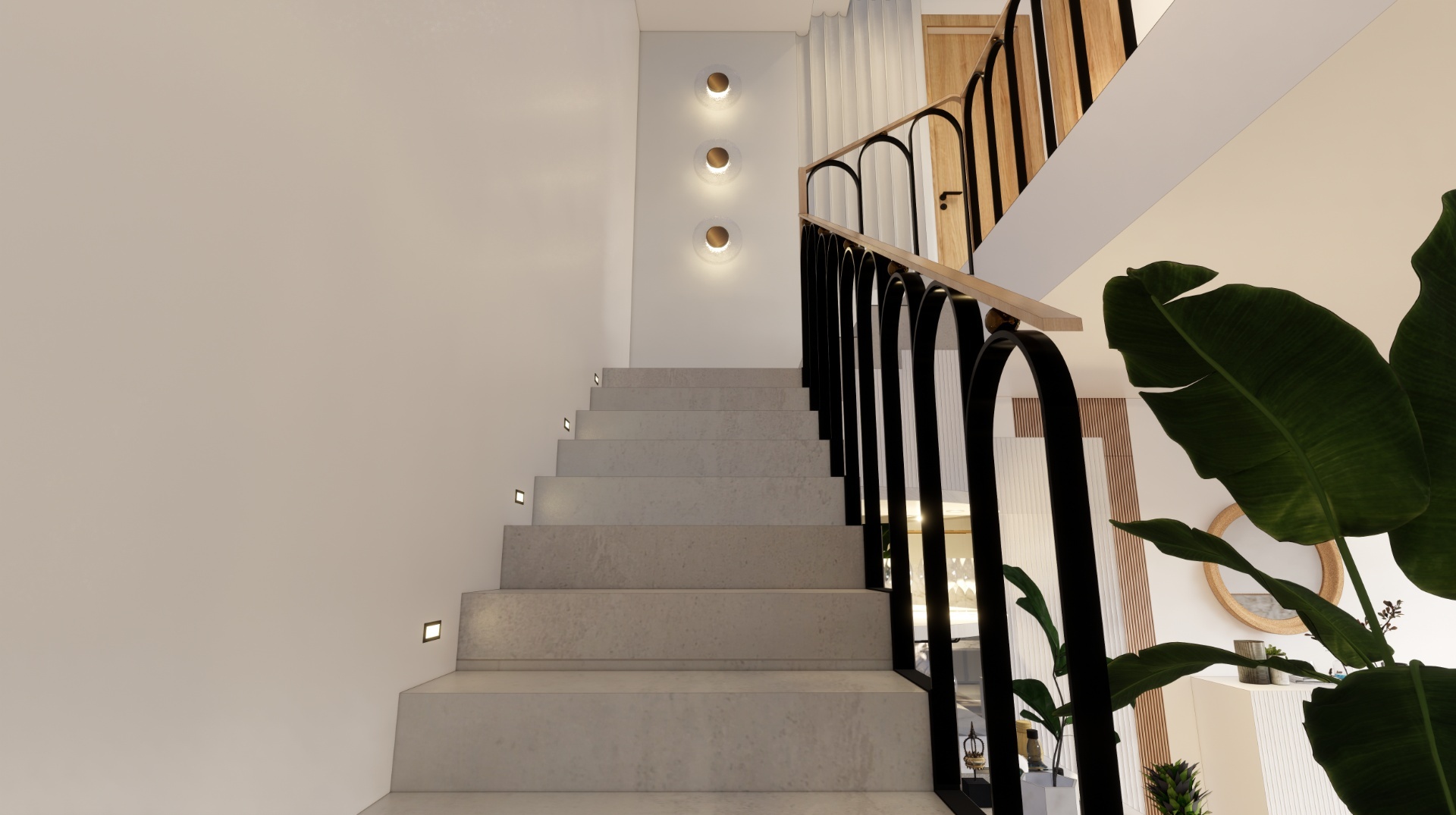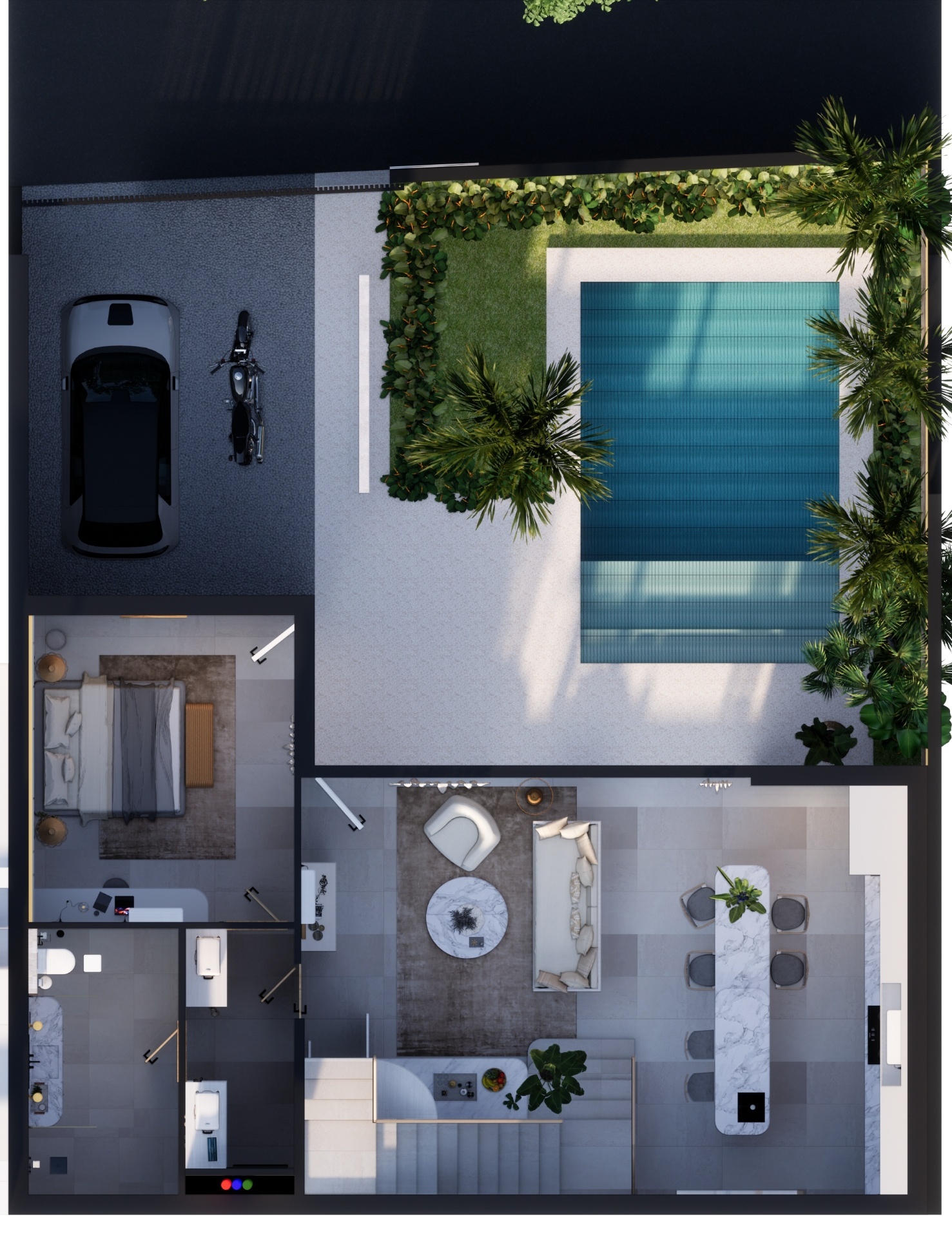 The layout offers three bedrooms with en-suite bathrooms, a kitchen with luminous interior furnishings, excellent quality and elegant design, an interconnected living area with stunning views thanks to French windows that provide natural lighting to the space. The cosiness of the space is beautifully complemented by the sunken sofa with fireplace. Every detail has its reason and is enhanced by the sensitively selected materials of unique design, as everything was made specifically for this project.