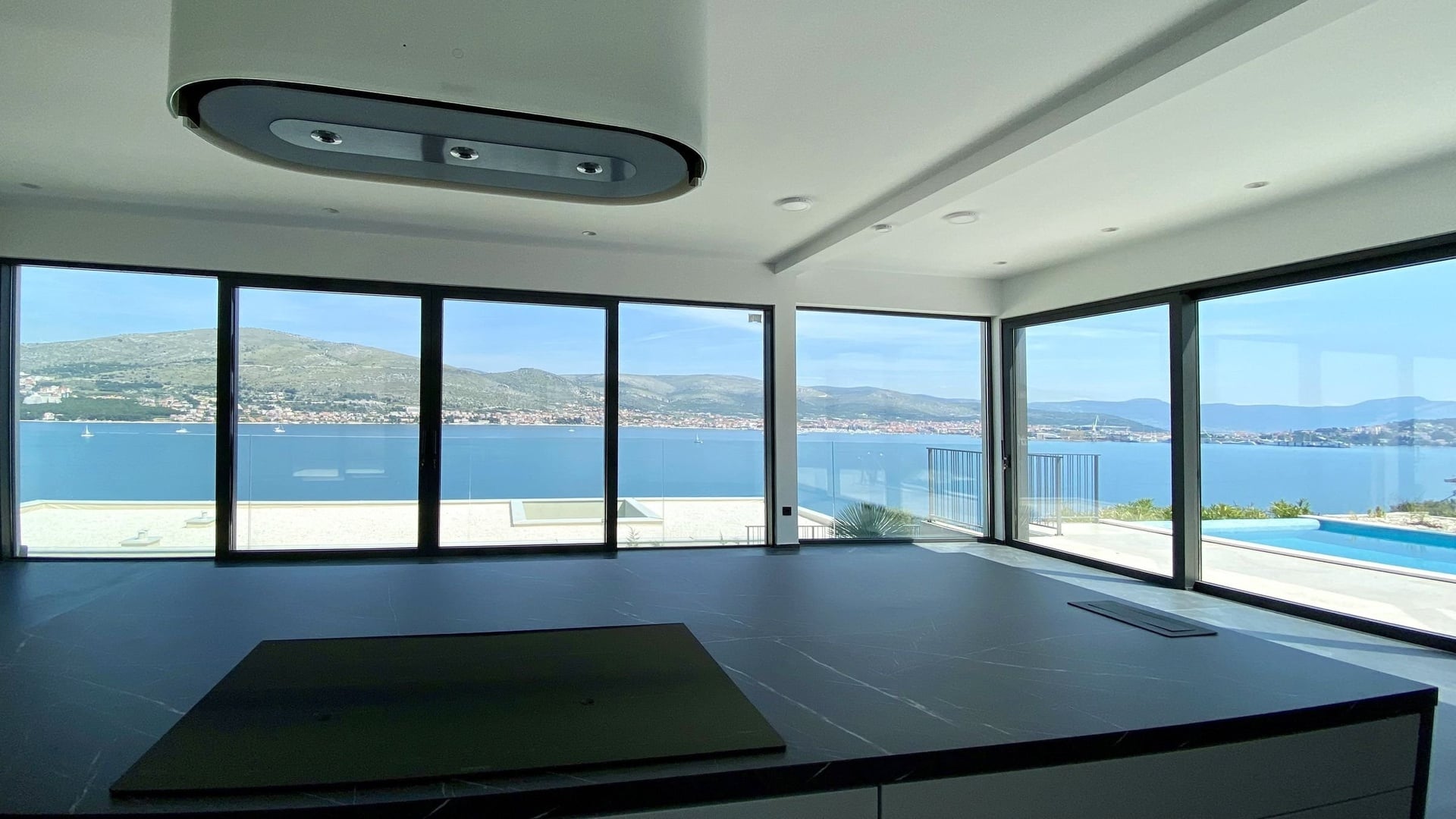 We offer for sale an elegant modern villa with a heated pool and stunning views of the Adriatic Sea, located just 100 meters from the coast in one of the most sought-after parts of the island of Čiovo in Dalmatia, Croatia. The property is situated in a quiet location with excellent access to the historic center of Trogir and Split International Airport, offering the perfect balance between privacy, comfort, and infrastructure.