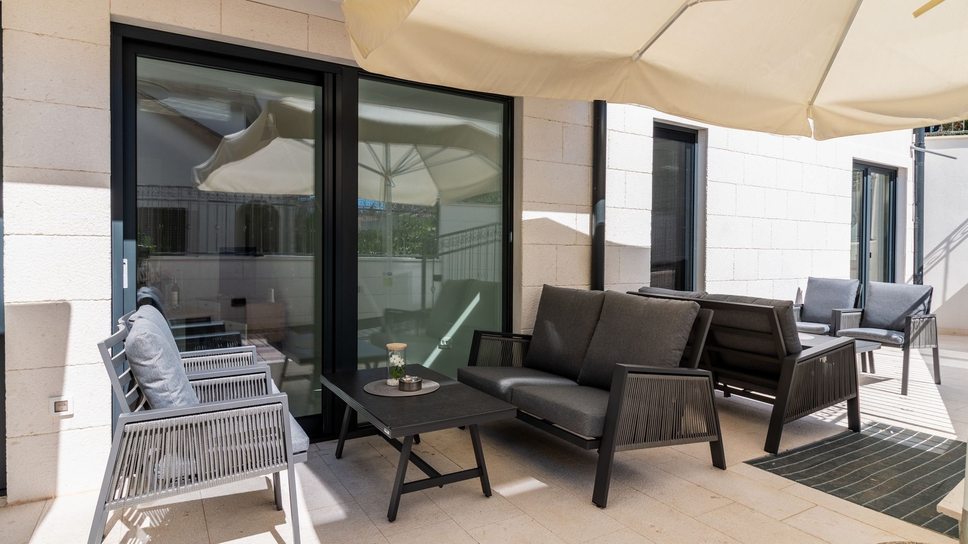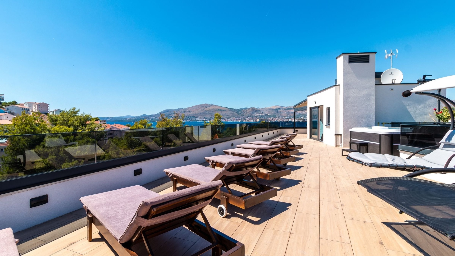 The entire second floor is dedicated to an exclusive penthouse apartment, featuring four bedrooms, three terraces, an outdoor kitchen, and direct access to a green rooftop terrace. This terrace is equipped with a jacuzzi, sunbathing zone, and a relaxation area, offering a stunning panoramic sea view, making the penthouse a truly exceptional space for living or premium rental.