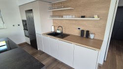 The villa is set on an 814 m² plot and features a total living area of 240 m² spread over three levels. The basement includes a garage, technical area for the pool, a solar-powered hot water tank, and a relaxation room. The ground floor provides both indoor and outdoor comfort – including a swimming pool with sunbathing area, sauna, outdoor shower, storage room, and a spacious covered terrace with a built-in grill. Inside, there is a large open-plan living room connected to the kitchen and dining area, a pantry, utility room, and a guest toilet.