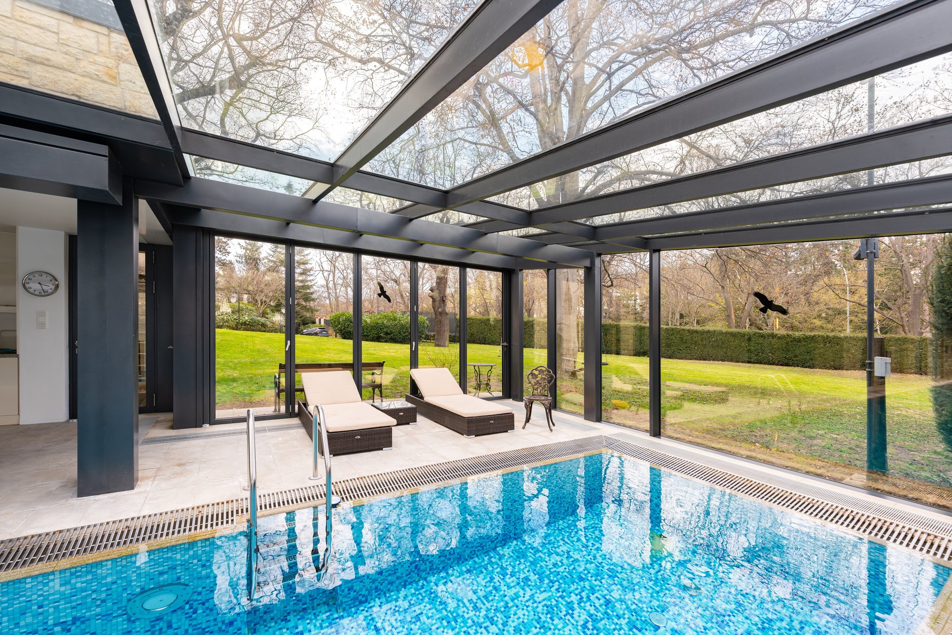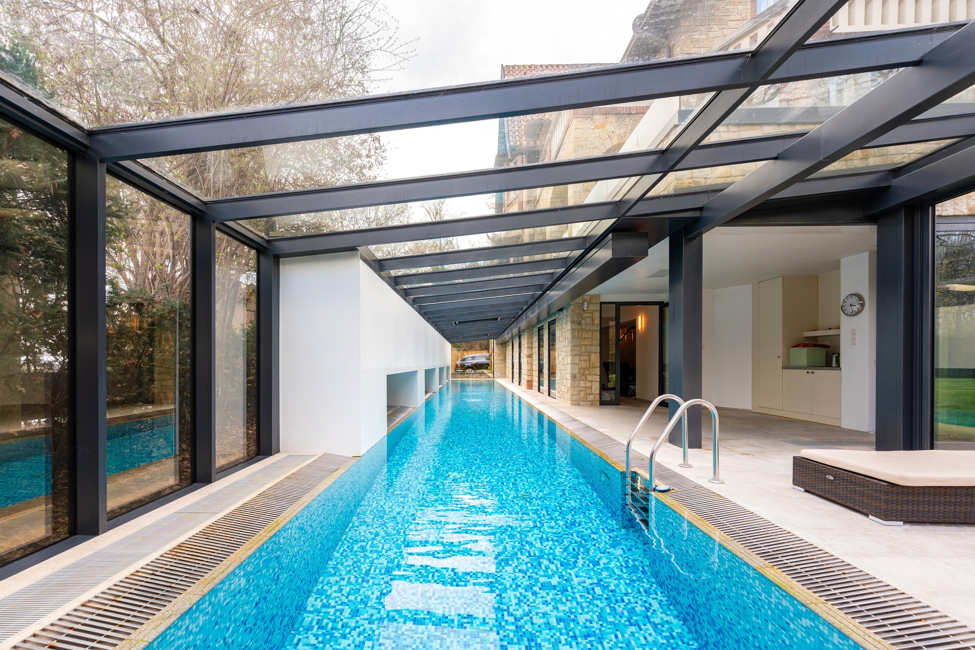 The house has a two-story basement. The first basement level features a wellness zone that offers maximum comfort and space for relaxation and active recreation. It includes a 25-meter indoor outdoor pool, a sauna, and a modern fitness center. This level also houses a laundry room and the home’s utility and storage facilities. The second basement level features a wine cellar.