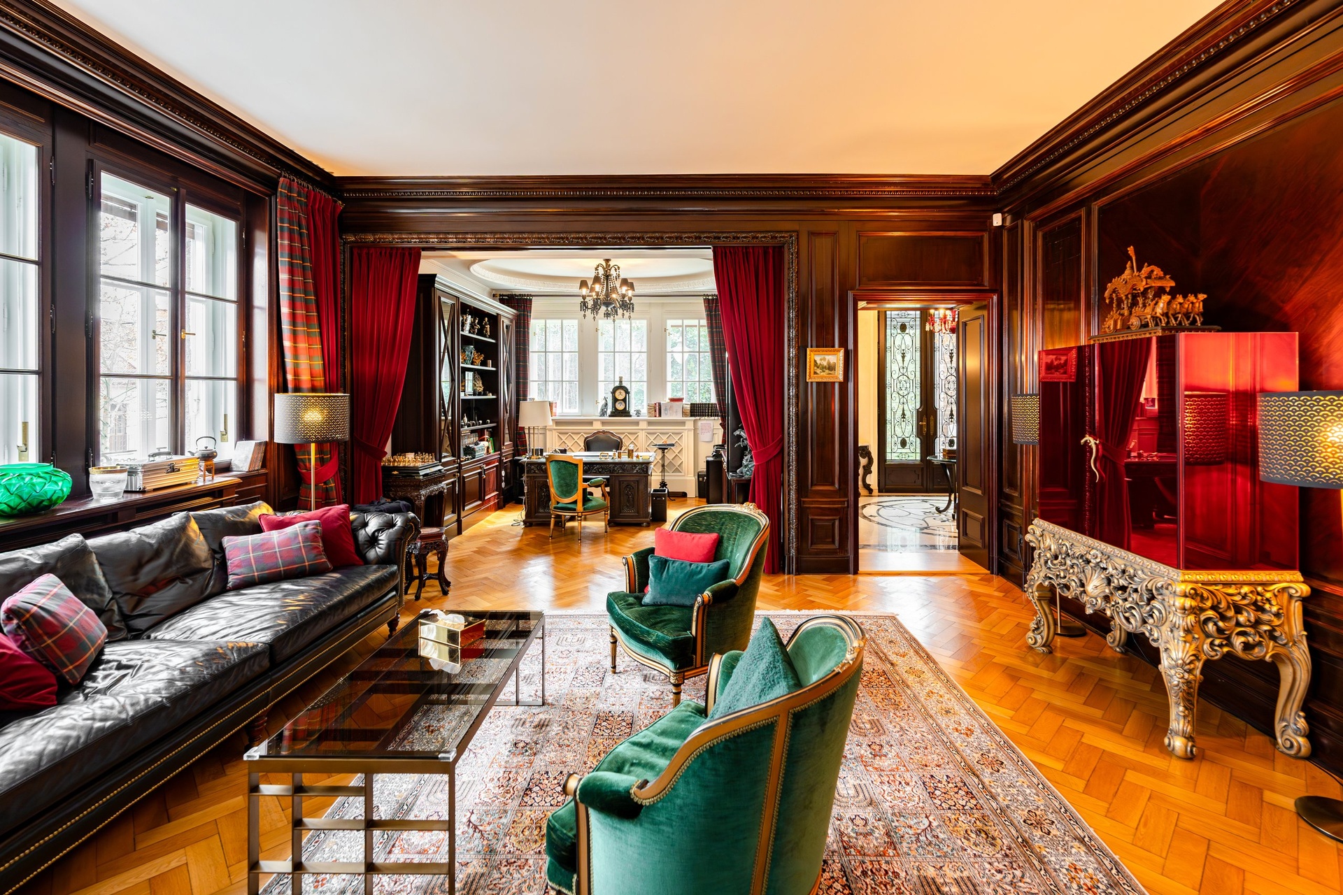 The layout of the house is thoughtfully designed and respects the original historical elements. The ground floor comprises the social area of the house. The entrance hall with a marble floor leads to a stately study with original wood paneling, a dining room and living room with views of Prague, and a large, stylish kitchen. All rooms are furnished in the spirit of the elegance characteristic of villas from the first quarter of the 20th century. The villa retains a high standard of artistic and artisanal elements, which were enhanced during the renovation by the integration of state-of-the-art technologies. The ground floor connects the house to the garden and terraces.