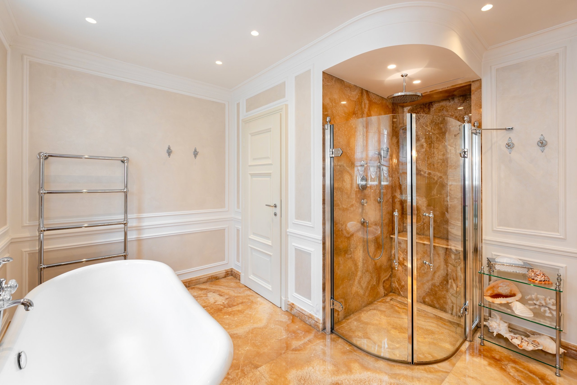 The first floor features private bedrooms and additional amenities for the owners’ maximum comfort. The master bedroom is connected to a walk-in closet and a large bathroom. There are also two additional bedrooms, which share a second bathroom on this floor.