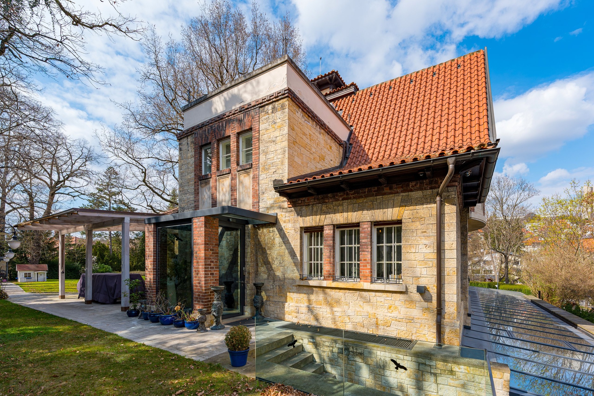 We are offering for sale a fully renovated villa built in 1910 with a floor area of 400 m², surrounded by a beautiful, expansive landscaped garden featuring unique mature trees. The property was built as part of a prestigious villa project by architect Viktor Beneš, influenced by English villa architecture. The lot is one of the largest private residential plots in the wider center of Prague, covering an area of 3,359 m².