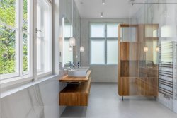 Security is ensured by a top-tier camera system and alarm with the option of connection to a central monitoring station. Living comfort is enhanced by a Loxone smart home system, allowing control via smartphone. Additional features include dimmable lighting with adjustable color temperature for warm evening tones and bright daylight illumination, individual room-based heating control including heated towel rails, a Buderus gas boiler, and a central water shut-off system. The property also offers on-site parking, a remote-controlled entrance gate, and preparation for electric vehicle charging and garden irrigation.
