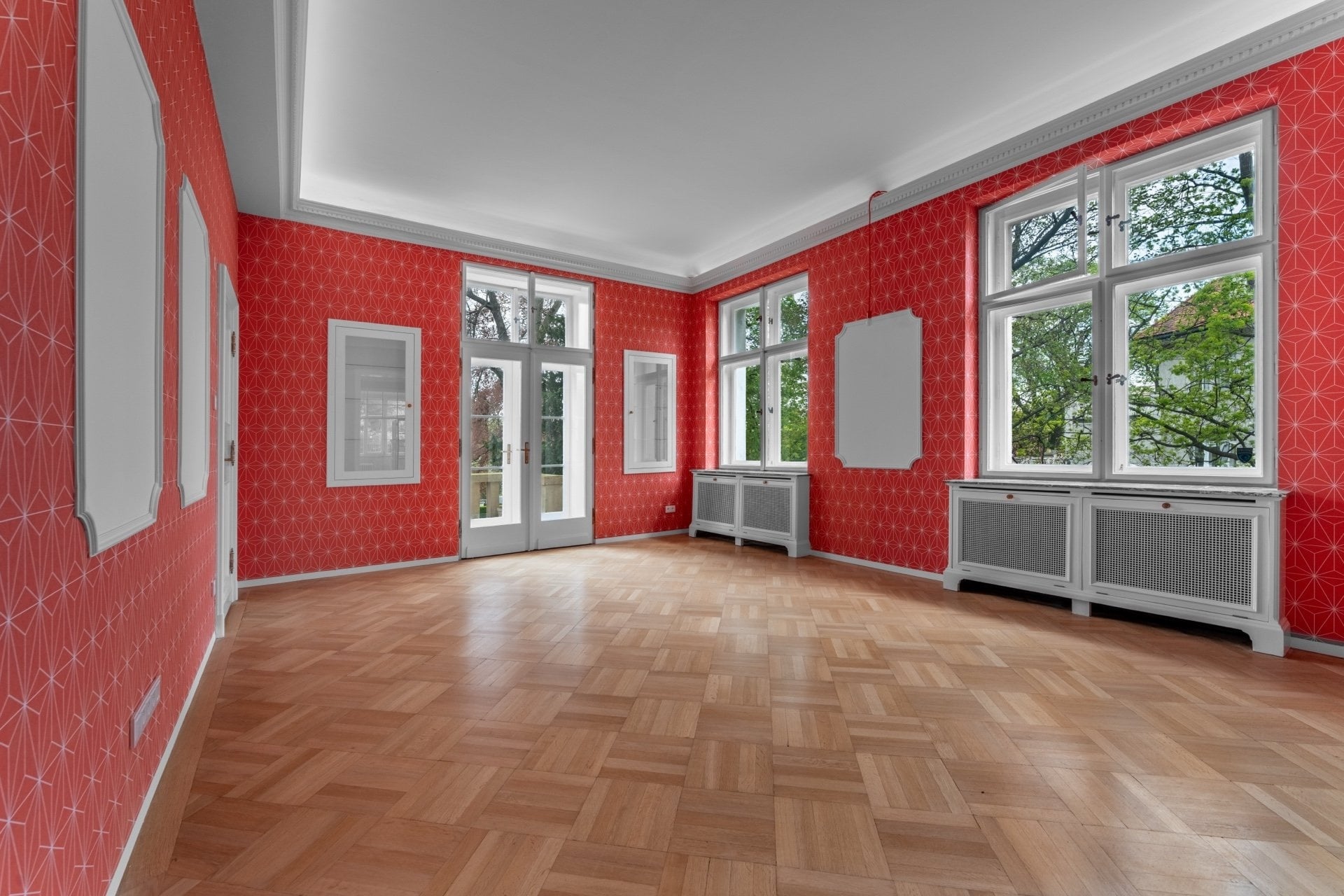 The villa’s technical equipment fully meets the standards of modern luxury living. The kitchen is fitted with premium Miele appliances, and both the kitchen and bathrooms feature underfloor heating. The bathrooms are finished with large-format Italian tiles and equipped with Villeroy & Boch and Hansgrohe sanitary ware. Solid wood built-in wardrobes are installed in dressing rooms, bedrooms, and storage areas, complemented by restored original wood paneling and floors.