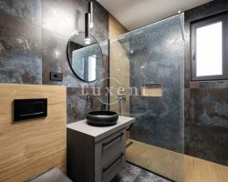 This designer villa has four bedrooms, three of which are located on the upper floor of the property and one on the ground floor. Each bedroom has its own bathroom. There is also a separate bathroom, a living room connected to the fully equipped kitchen and a dining room with access to the lower terrace. From the upper terrace on the first floor you can enjoy the view of the