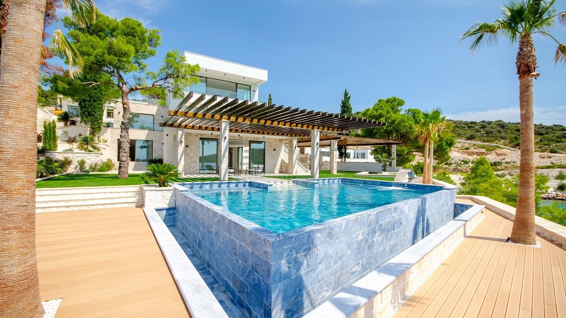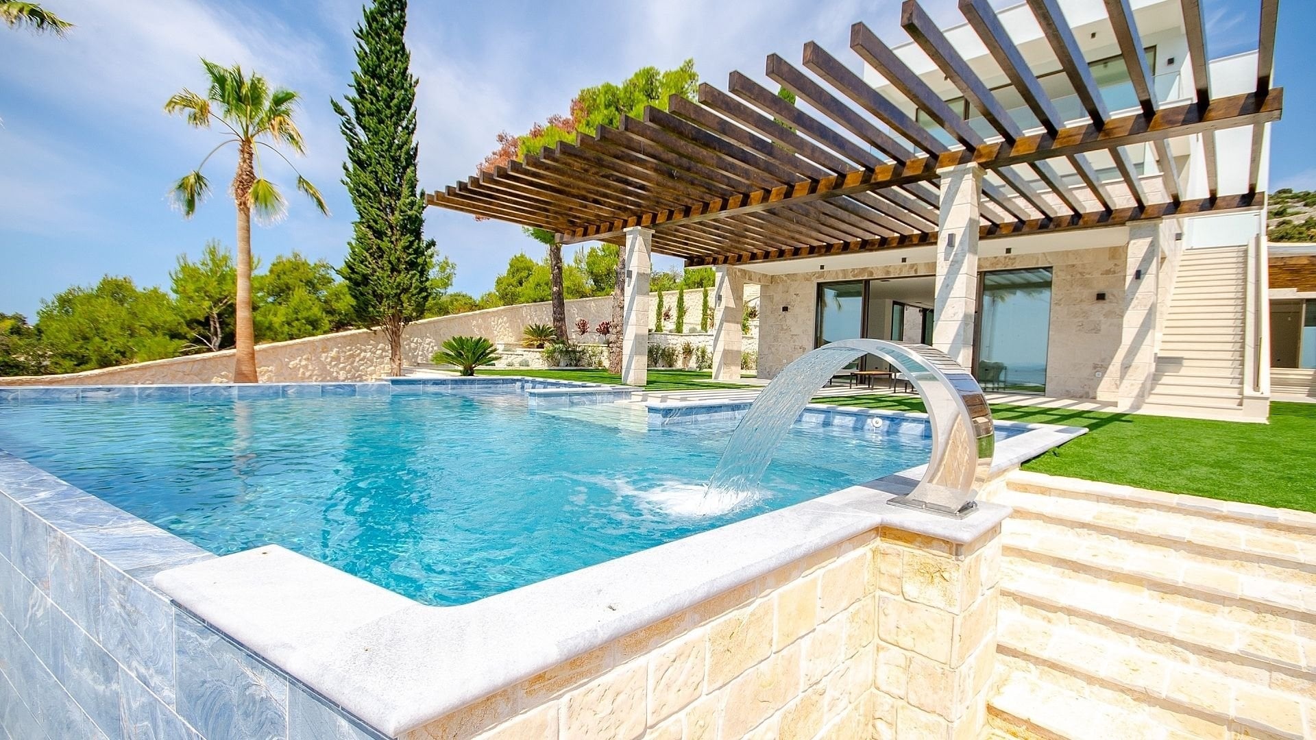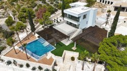 The residence is arranged on three levels connected by an internal staircase and elevator, ensuring convenient access to all parts of the house. It offers four elegantly furnished bedrooms, each with plenty of space and light, and six modern bathrooms. The central part of the house consists of an open-plan kitchen, dining room, and living area, ideal for family moments and social events. Large windows connect the interior with the exterior and allow unobstructed sea views from every part of the house.