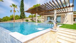 The outdoor area of the villa is designed as a peaceful retreat with a heated infinity pool, sun terrace, and relaxation area in complete privacy. There is also a spacious driveway and covered parking to accommodate even larger families or visitors.