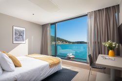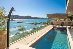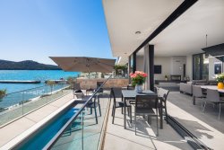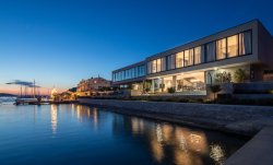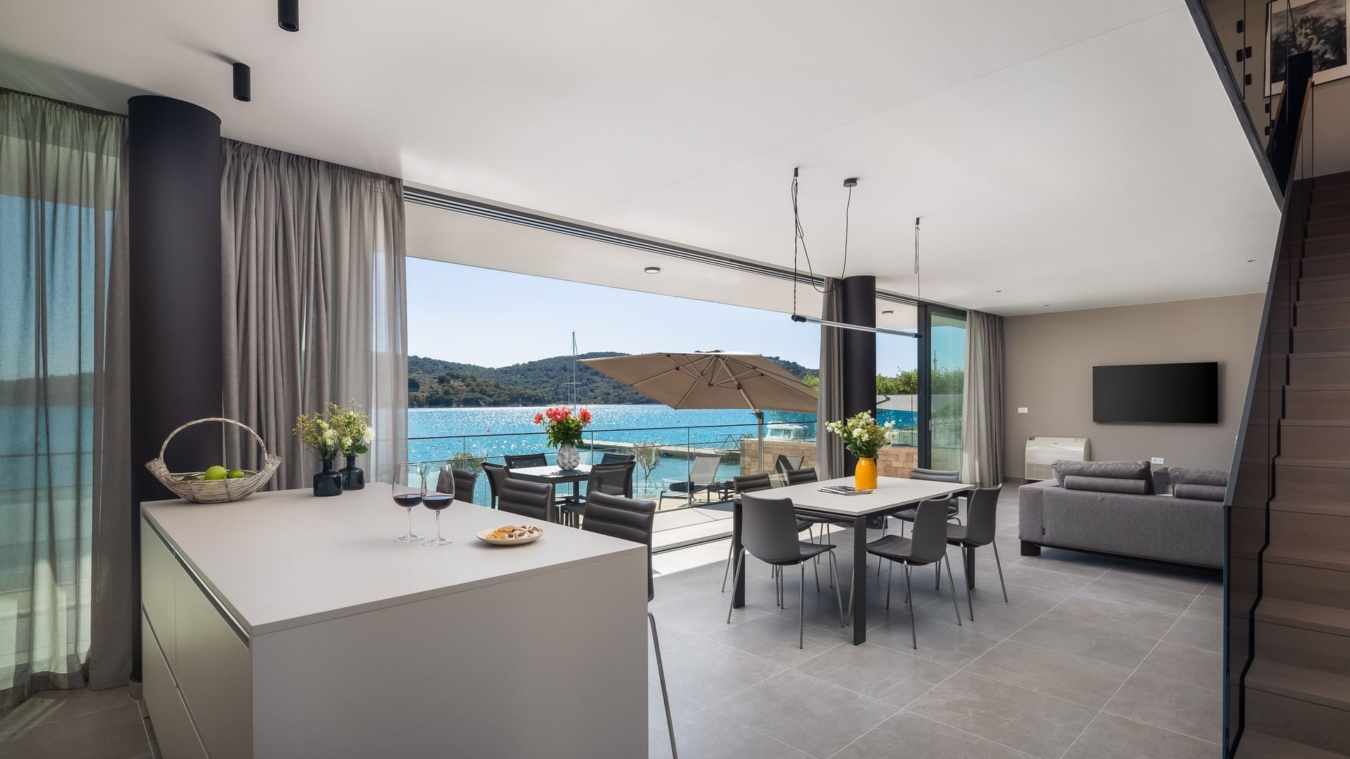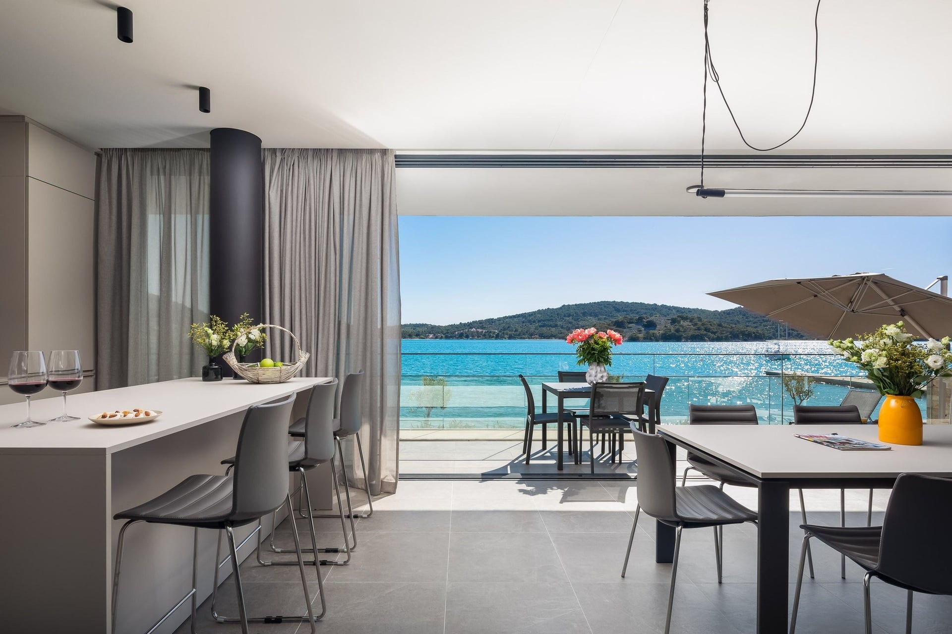 We offer for sale a new luxury villa situated in the first row by the sea, in one of the most attractive destinations for yachtsmen on the Adriatic. This exceptional property is located just a few steps from the landscaped, stone-paved coastline, where it has its own mooring for a boat. Thanks to its southern orientation and large glass walls, the villa offers breathtaking panoramic views of the sea and surrounding islands from all living areas.
