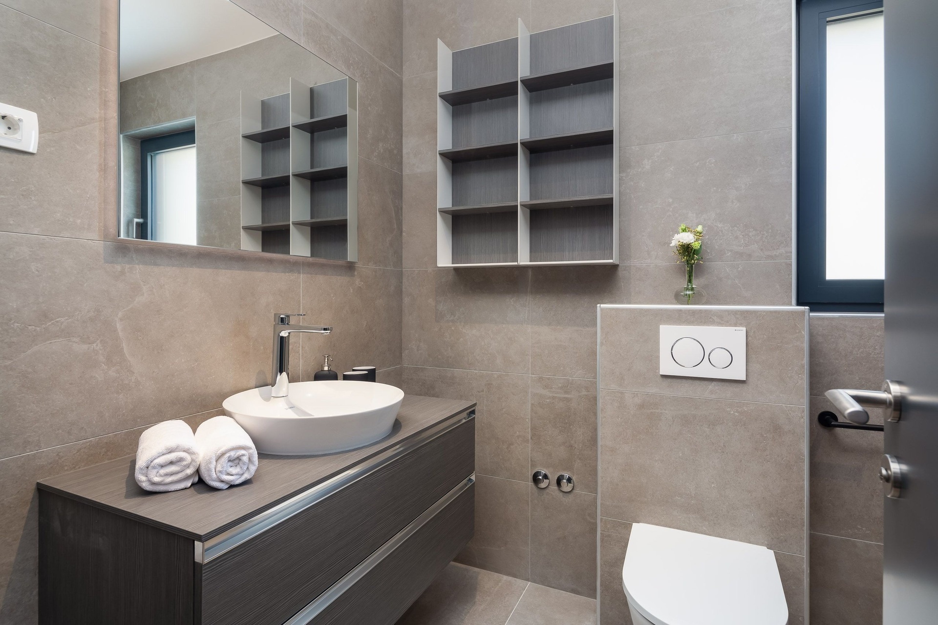 The villa is spread over two floors. On the ground floor there is a spacious living room connected to the kitchen and dining room, a bathroom and a cloakroom. The dominant feature of this floor are large sliding glass walls, which, when opened, completely connect the interior with the outdoor terrace, sun terrace, and pool, creating a harmonious and seamless transition between the indoor and outdoor spaces.
