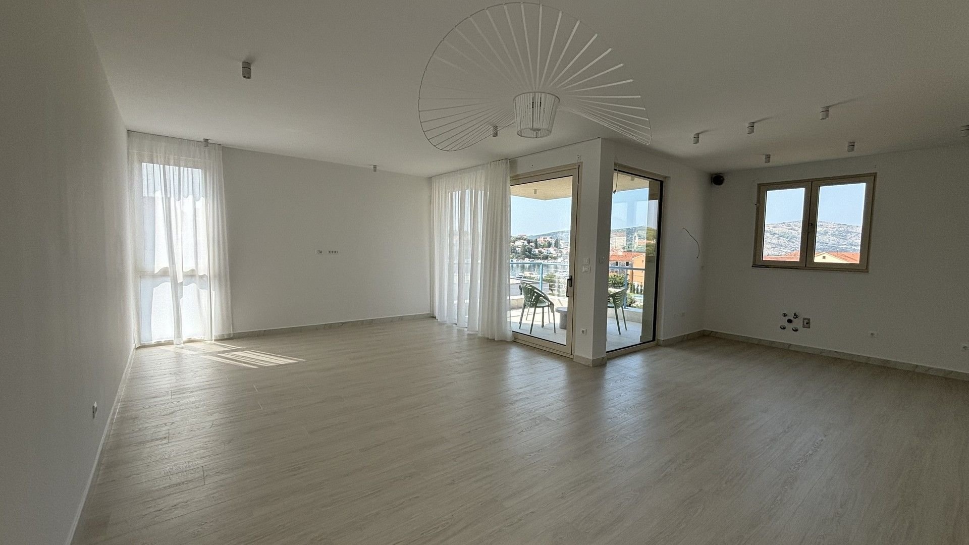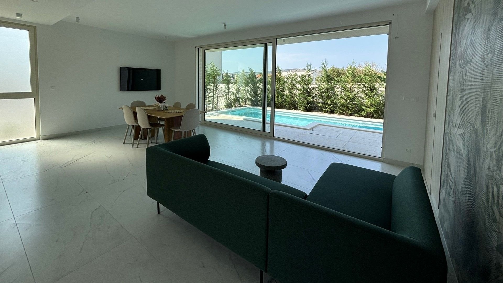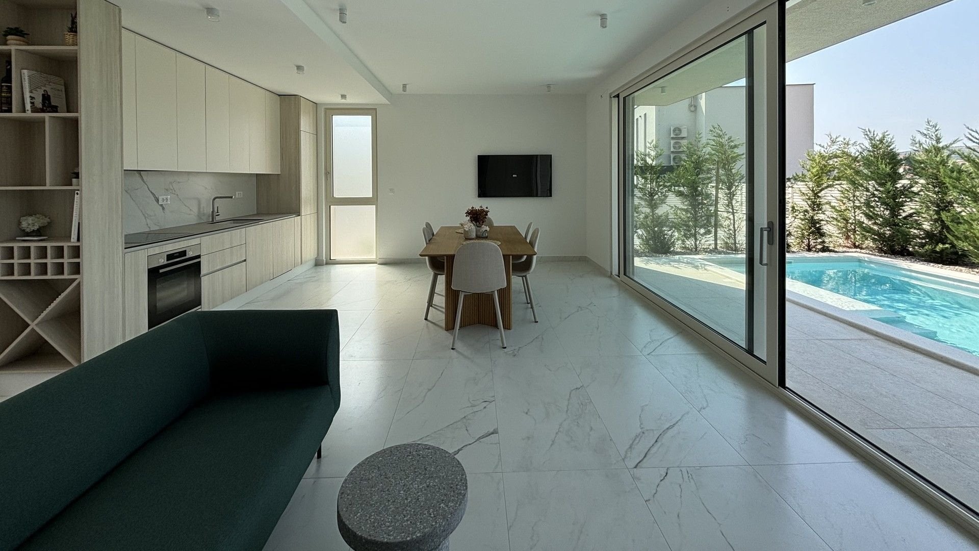 Newly built semi-detached villa with private pool for sale is located in a quiet location near Trogir, just 80 m from the sea. On a plot of 565 sqm there is a three-storey villa with a total living area of 200 sqm.