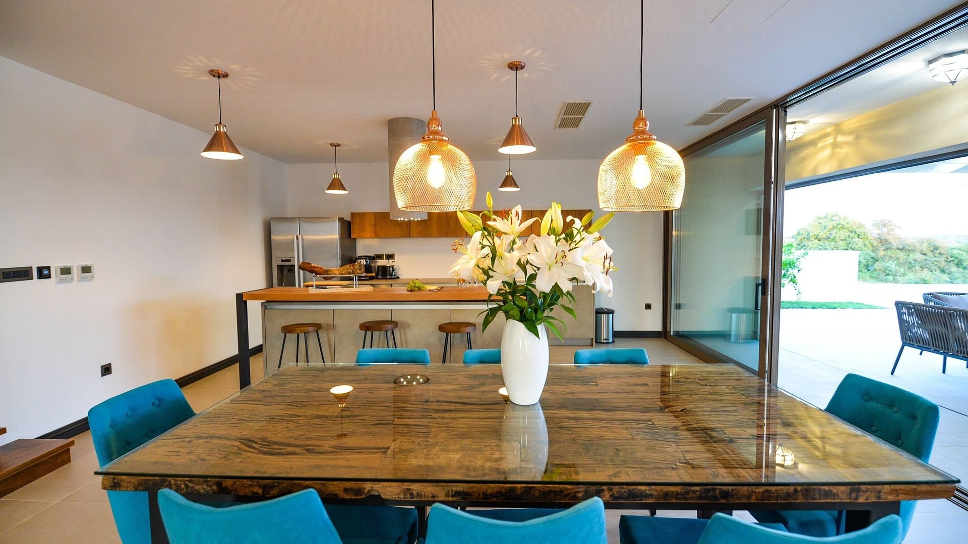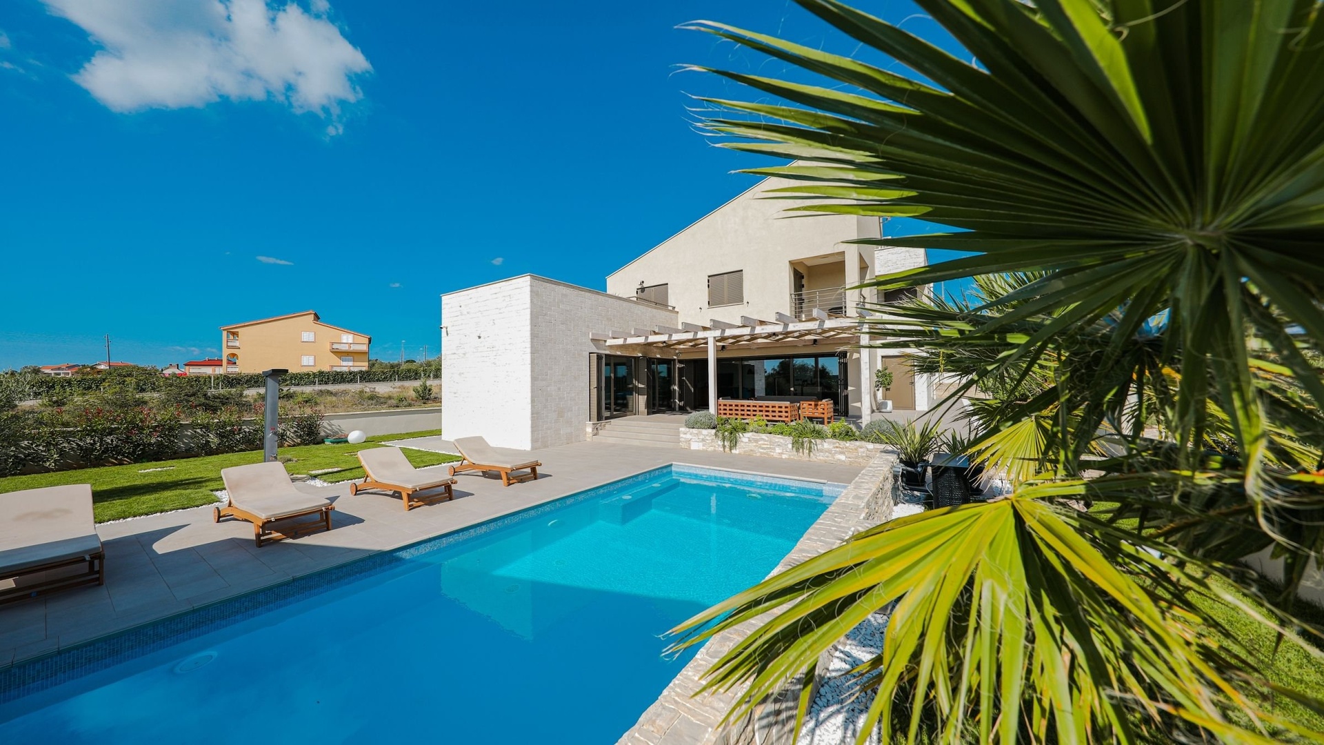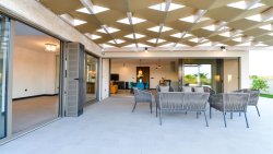 The main residential part consists of an elegant villa with a spacious interior, which includes three bedrooms, five bathrooms, a modern gym, a relaxing sauna, and a whirlpool. The center of the exterior is a private pool surrounded by a sun terrace and an outdoor fireplace – an ideal space for relaxation and socializing.