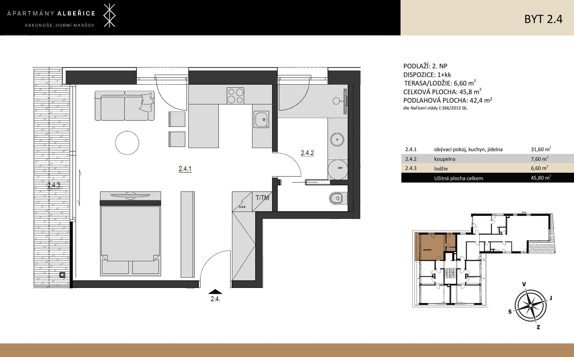 V nově vznikajícím projektu Apartmány Albeřice nabízíme k prodeji apartmán o dispozici 1+kk a ploše 39,2 m2 s lodžií 6,6 m2 – celkem 45,8 m2. Apartmán se nachází ve 2. NP projektu a je orientován na SV. Vybaven je ve vysokém standardu, který je možné rozšířit do nadstandardního provedení, zejména co do rozsahu obložení stěn a stropů jednotlivých pokojů rustikálním stařeným dřevem. K apartmánu patří úložné prostory v zabezpečeném samostatném skladu. Další jeho součástí je kryté parkovací stání. K využití bude také společná lyžárna v 1. NP s uzamykatelnými boxy.