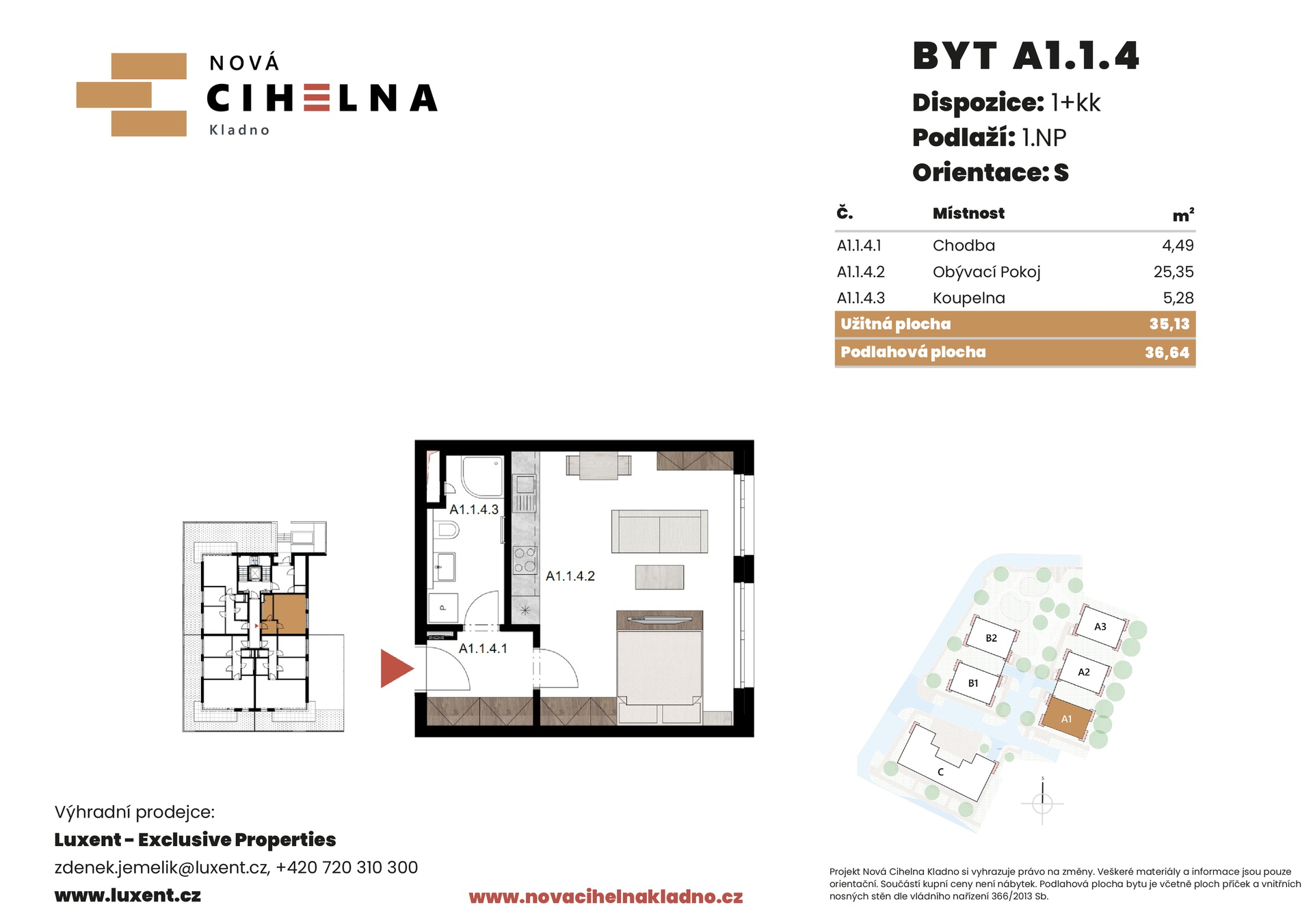 Nabízíme k prodeji byt 1+kk o podlahové ploše 36,64 m² v mimořádně úsporném developerském projektu Nová Cihelna Kladno vznikajícím v městské čtvrti Kladno – Rozdělov.
