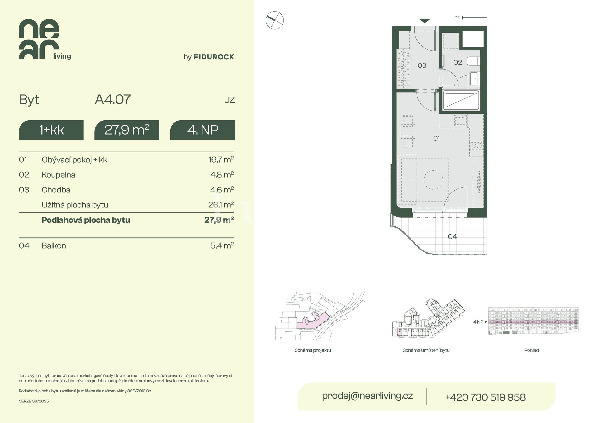 Nabízíme k prodeji byt 1+kk o podlahové ploše 27,9 m² s balkonem 5,4 m² v developerském projektu NEAR living v Praze 8, vznikajícím na pomezí Palmovky a Karlína.