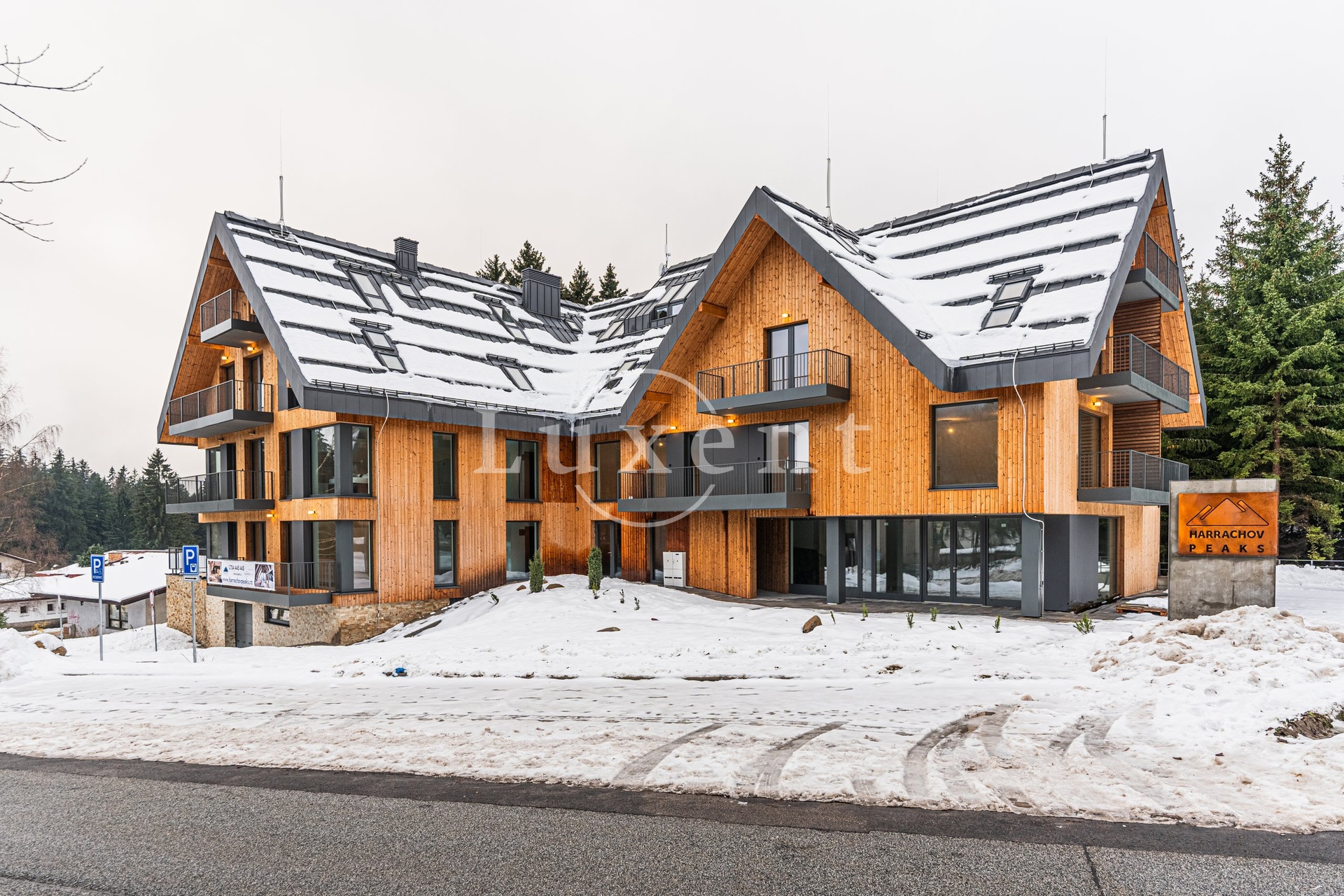 Harrachov Peaks je luxusní projekt vystavěný z kvalitních přírodních materiálů s wellness se saunou a vířivkou a plně vybaveným fitness. Představuje pouze 16 moderních apartmánů a nabízí tak komorní atmosféru v domě pro jejich majitele. Svým konceptem uspokojí zájemce jako o druhé bydlení v Krkonoších, tak investory se záměrem zajistit své finance nebo praktikovat výnosové krátkodobé pronájmy. Součástí nabídky je i správa apartmánů včetně pronájmů. Projekt HARRACHOV PEAKS nabízí vysoký standard vybavení – dubové podlahy, dřevěné terasy, velkoformátové obklady v koupelnách a na chodbách a další. Vytápění probíhá tepelnými čerpadly a je rozvedeno podlahovým topným systémem. V bytě je rekuperace. Energetická třída je velmi úspornou B.
