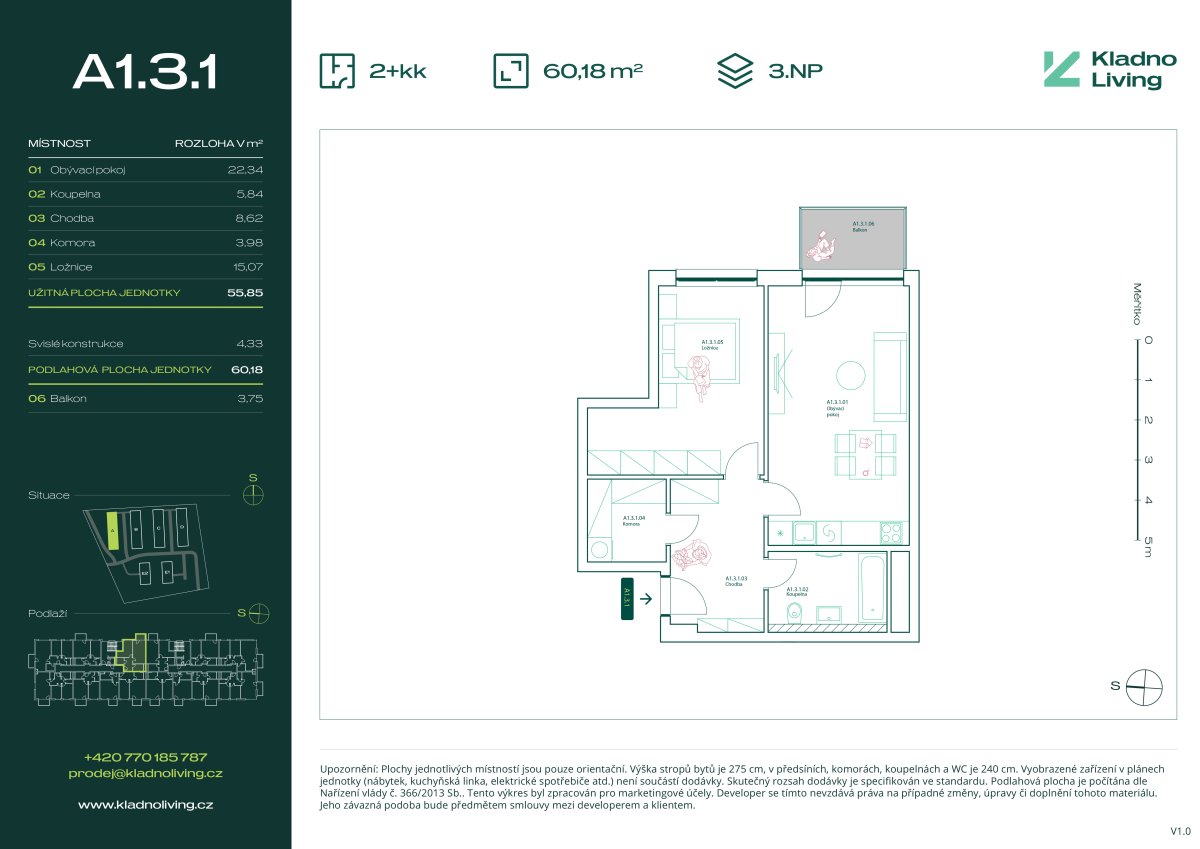 Nabízíme ke koupi moderní byt 2+kk o podlahové ploše 60,2 m² s balkonem 3,8 m² v rezidenčním projektu Kladno Living, který vzniká v jedné z nejatraktivnějších lokalit města Kladno – Kročehlavy. Tento nový developerský projekt představuje jedinečnou příležitost pro ty, kteří hledají nové byty v Kladně nebo investici do nemovitosti s vysokým potenciálem zhodnocení.