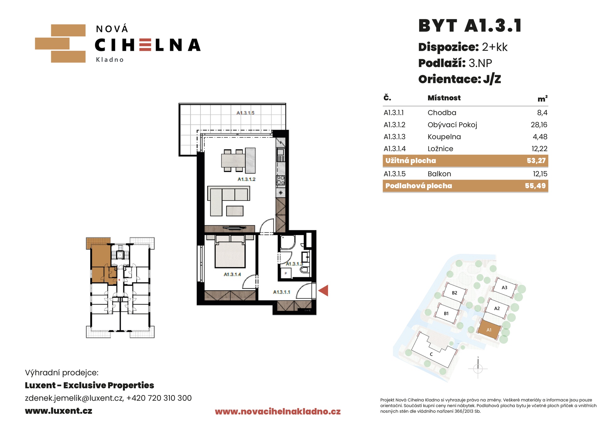 Nabízíme k prodeji byt 2+kk o podlahové ploše 55,49 m² s balkonem 12,15 m² v mimořádně úsporném developerském projektu Nová Cihelna Kladno vznikajícím v městské čtvrti Kladno – Rozdělov.