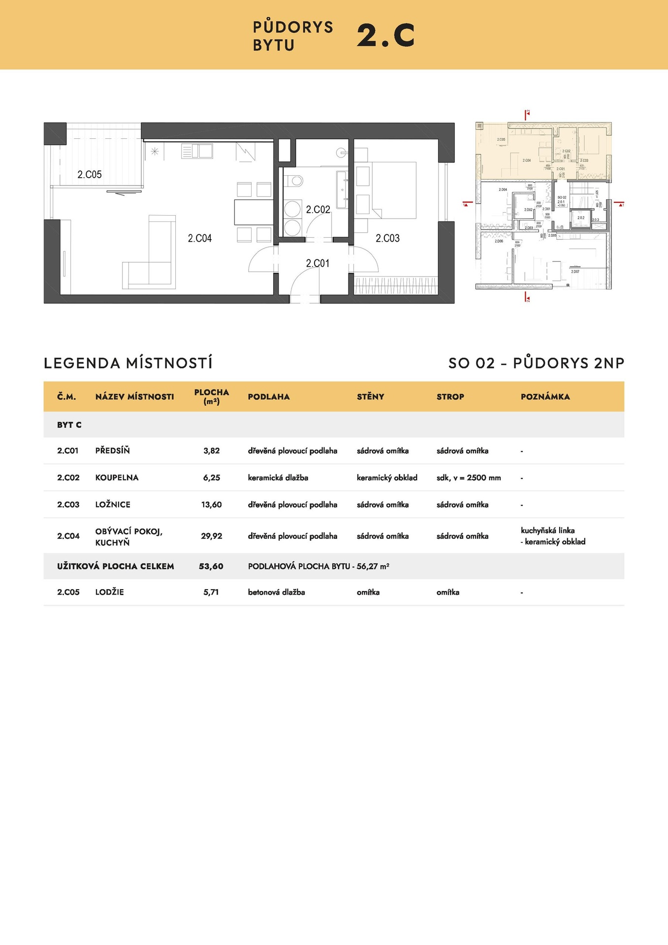 Byt o dispozici 2+kk a podlahové ploše 56,5 m2 se nachází ve druhém nadzemním podlaží budovy B a zahrnuje předsíň se vstupem do koupelny se sprchovým koutem a toaletou. Dále se zde nachází ložnice a prostorný obývací pokoj s kuchyňským koutem, oba se vstupem na krytou lodžii (5,71 m2).