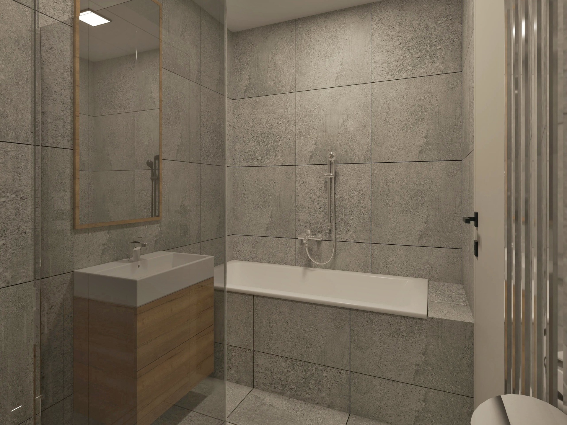 Byt o dispozici 2+kk a podlahové ploše 56,5 m2 se nachází ve třetím nadzemním podlaží budovy B a zahrnuje předsíň se vstupem do koupelny se sprchovým koutem a toaletou. Dále se zde nachází ložnice a prostorný obývací pokoj s kuchyňským koutem, oba se vstupem na krytou lodžii (5,04 m2).
