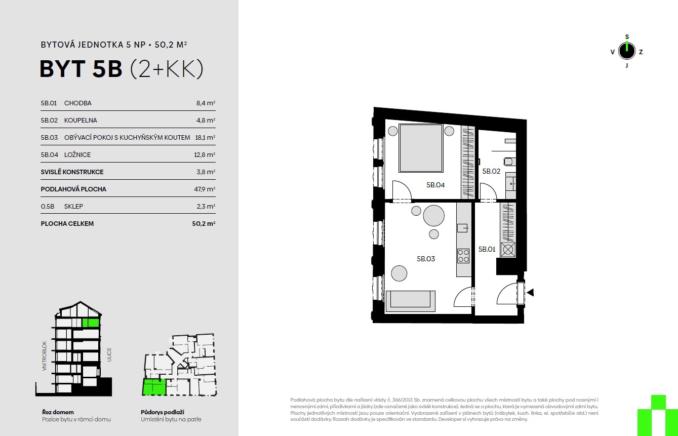 Plocha jednotky celkem činí 50,2 m², byt je navržen ve vysokém standardu. Obytný prostor doplňuje dřevěná podlaha FREVINI MONACO, pokládaná ve vzoru chevron. Interiérové dveře kombinují klasické dřevěné prvky s ocelovými skleněnými dveřmi se strukturovaným a čirým sklem, čímž podtrhují moderní charakter prostoru. K bytu náleží sklep.