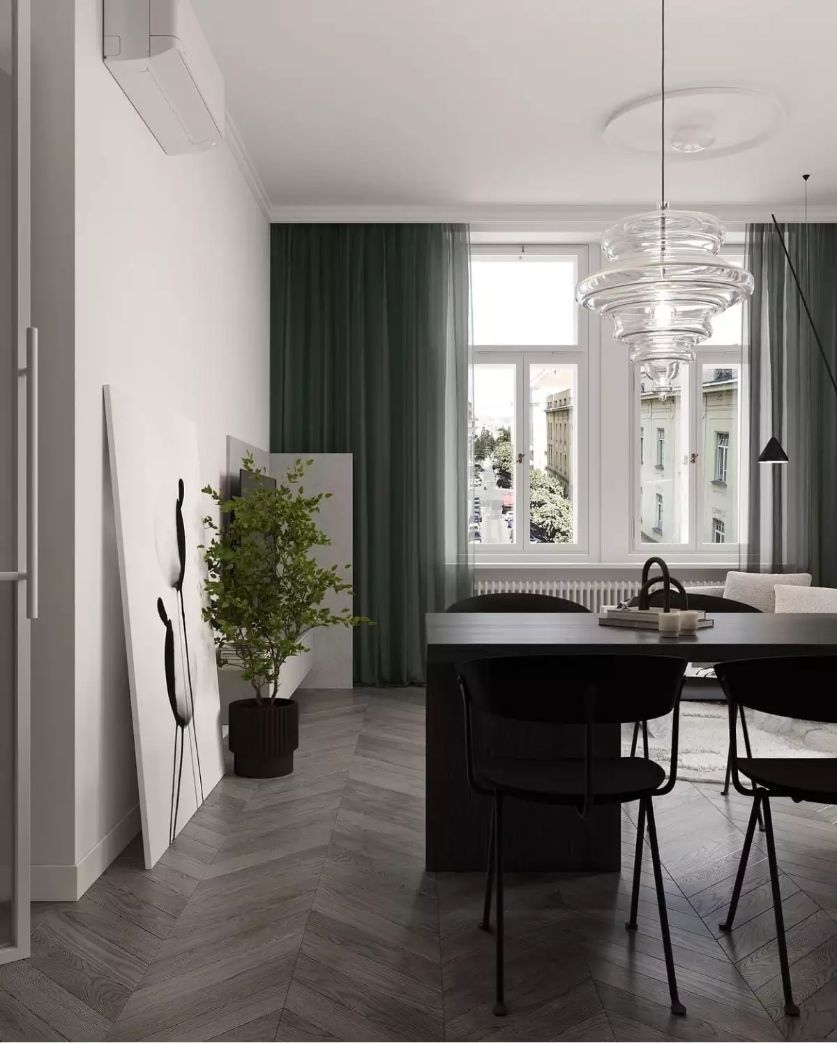 Elektroinstalace je osazena designovými vypínači a zásuvkami JUNG LS 990. V bytě jsou instalována zapuštěná bodová svítidla McLED TORO a samozřejmostí je také nástěnná klimatizační jednotka pro zajištění komfortu v letních měsících.
