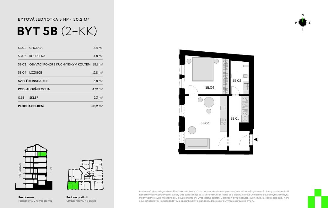 Plocha jednotky celkem činí 50,2 m², byt je navržen ve vysokém standardu. Obytný prostor doplňuje dřevěná podlaha FREVINI MONACO, pokládaná ve vzoru chevron. Interiérové dveře kombinují klasické dřevěné prvky s ocelovými skleněnými dveřmi se strukturovaným a čirým sklem, čímž podtrhují moderní charakter prostoru. K bytu náleží sklep.
