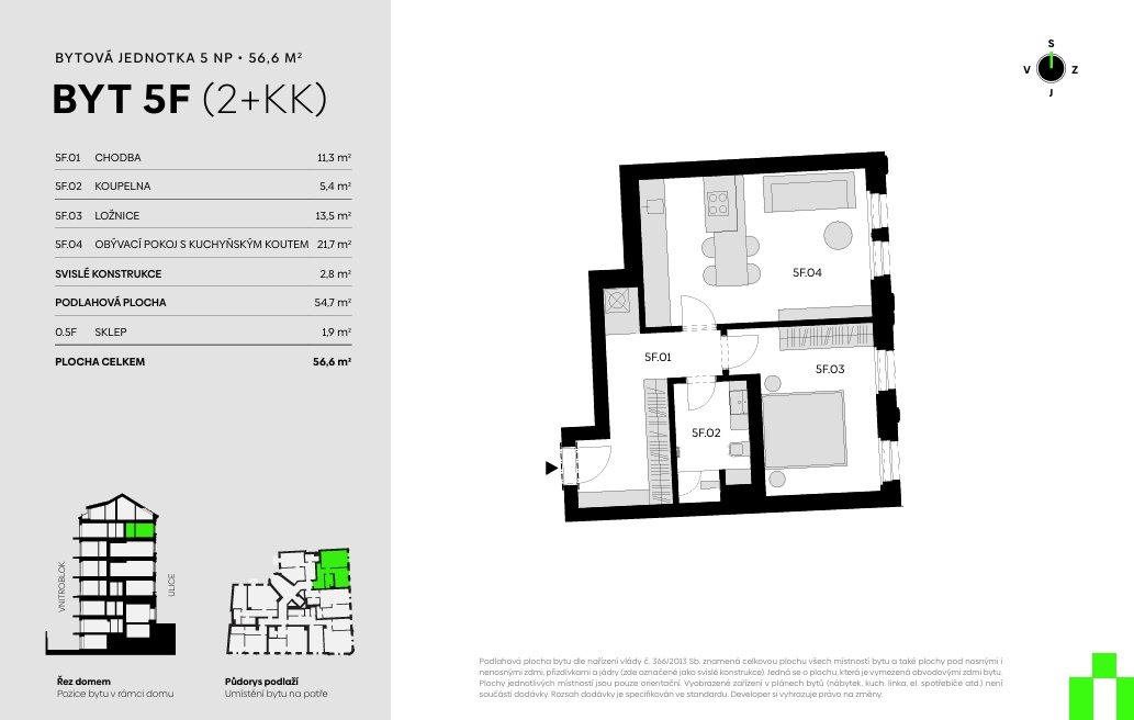 Plocha jednotky celkem činí 56,6 m², byt je navržen ve vysokém standardu. Obytný prostor doplňuje dřevěná podlaha FREVINI MONACO, pokládaná ve vzoru chevron. Interiérové dveře kombinují klasické dřevěné prvky s ocelovými skleněnými dveřmi se strukturovaným a čirým sklem, čímž podtrhují moderní charakter prostoru. K bytu náleží sklep.