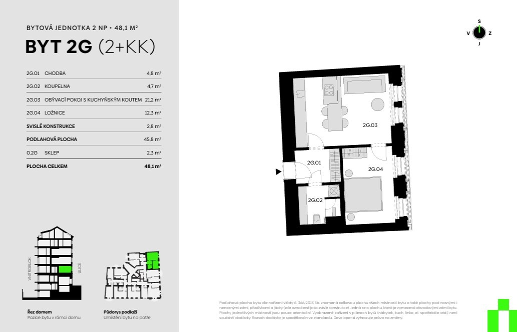 Plocha jednotky celkem činí 48,1 m², byt je navržen ve vysokém standardu. Obytný prostor doplňuje dřevěná podlaha FREVINI MONACO, pokládaná ve vzoru chevron. Interiérové dveře kombinují klasické dřevěné prvky s ocelovými skleněnými dveřmi se strukturovaným a čirým sklem, čímž podtrhují moderní charakter prostoru. K bytu náleží sklep.