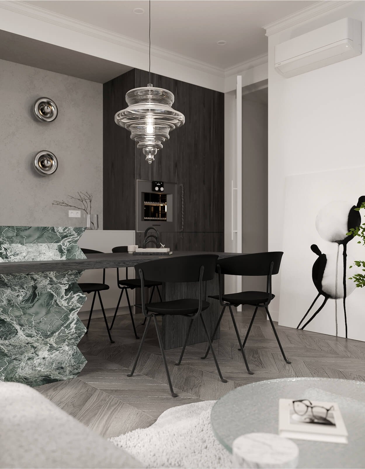 Elektroinstalace je osazena designovými vypínači a zásuvkami JUNG LS 990. V bytě jsou instalována zapuštěná bodová svítidla McLED TORO a samozřejmostí je také nástěnná klimatizační jednotka pro zajištění komfortu v letních měsících.