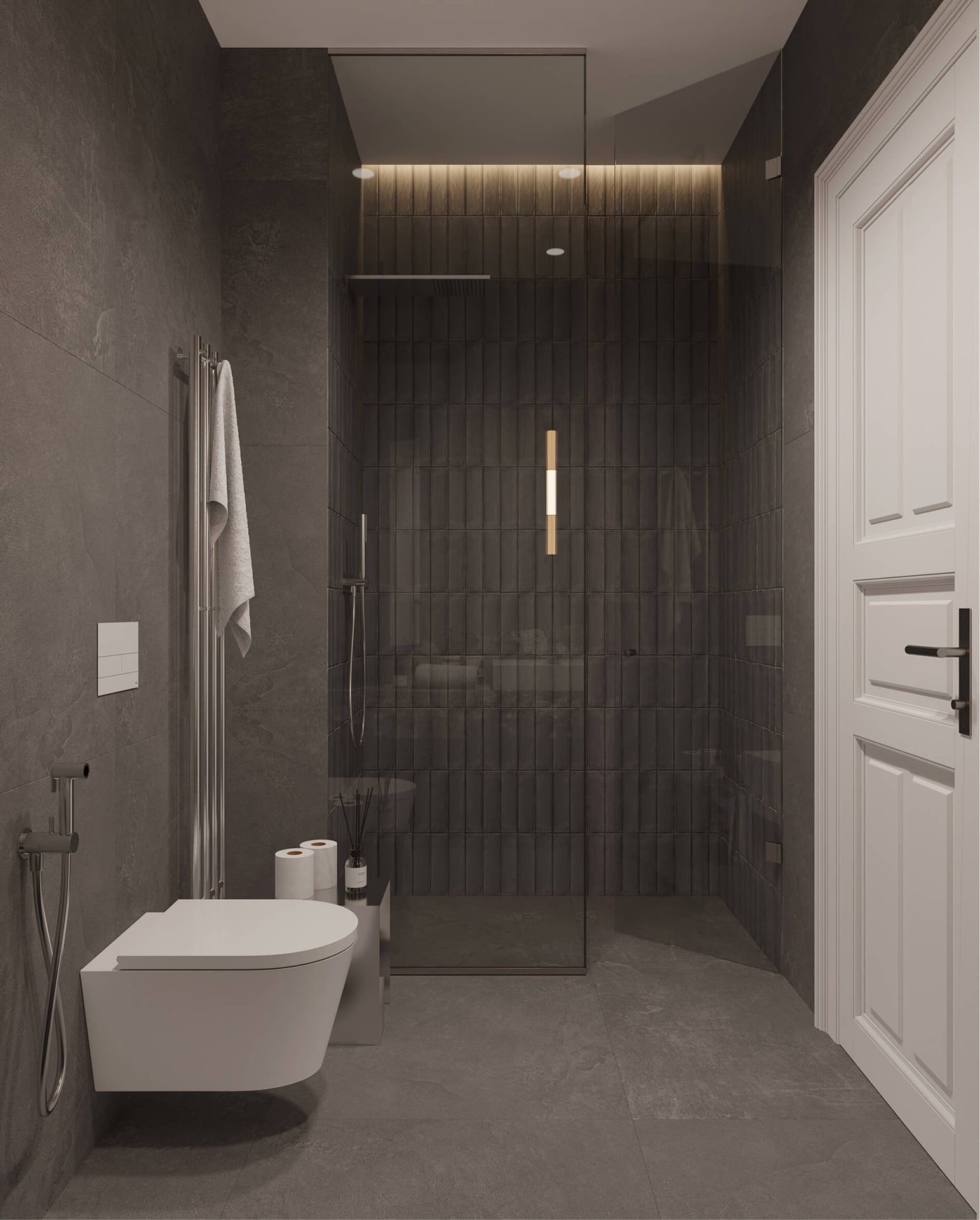Koupelna je vybavena sanitou LAUFEN KARTELL, keramické obklady a dlažby EMIL CERAMICA v moderních odstínech dodávají koupelně nadčasový vzhled.
