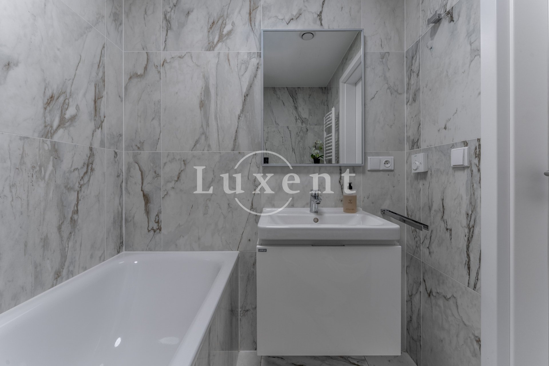 Byt má jednotný minimalistický a nadčasový design. V nemovitosti jsou použity kvalitní materiály, podlahové vytápění, rekuperace, velkoformátová dřevěná okna s trojskly a předokenními žaluziemi. V obývacím pokoji je umístěna klimatizační jednotka. Podlahová krytina byla zvolena v kombinaci dlažby a plovoucí dřevěné podlahy, která je v ložnici.