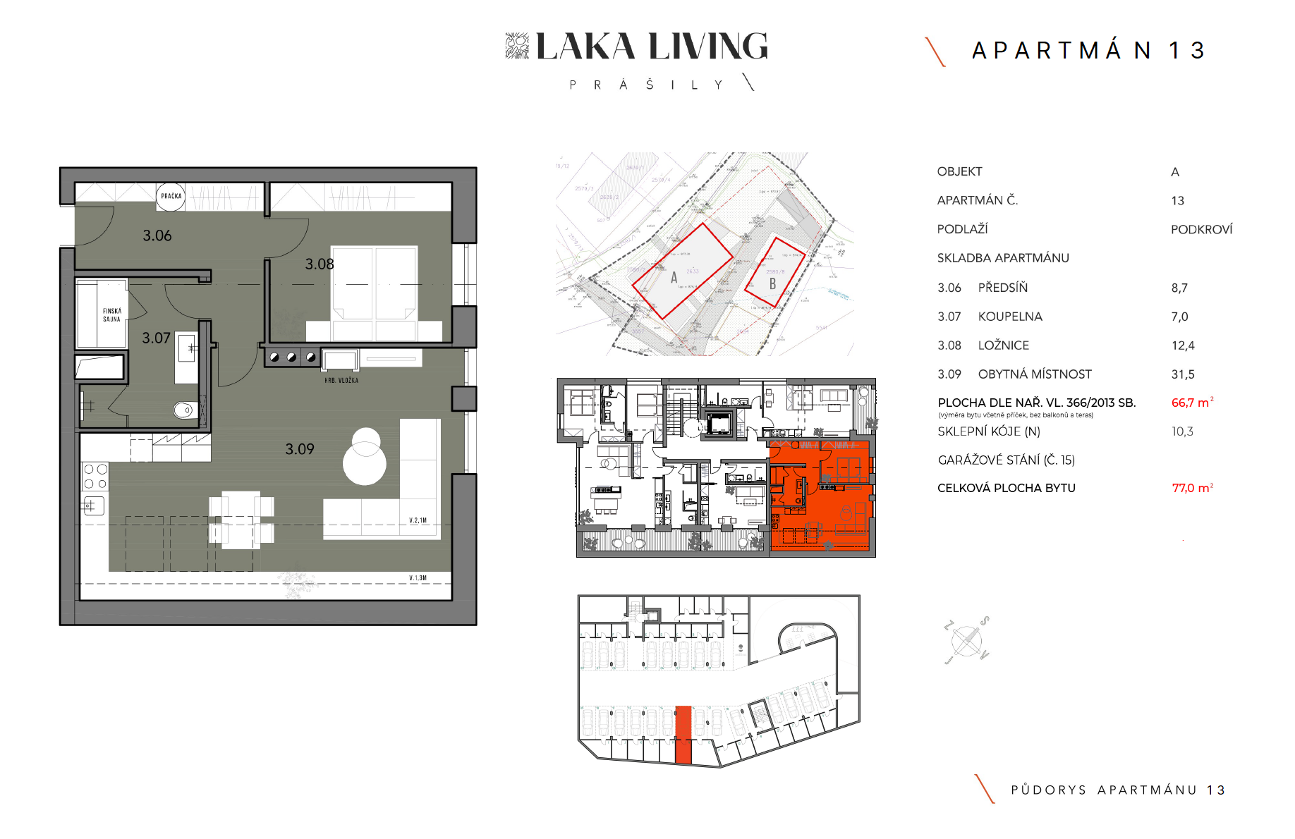 Nabízíme k prodeji luxusní horský apartmán o dispozici 2+kk o obytné ploše 59,6 m² a podlahové ploše 66,7 m². Byt se nachází v podkroví podlaží apartmánového domu „A“ v nově vznikajícím developerském projektu LAKA LIVING na Šumavě. Apartmán je orientován na JV-SV. Byt se skládá z obytné místnosti (31,5 m²), ložnice (12,4 m²), koupelny s toaletou (7 m²) a předsíně (8,7 m²).