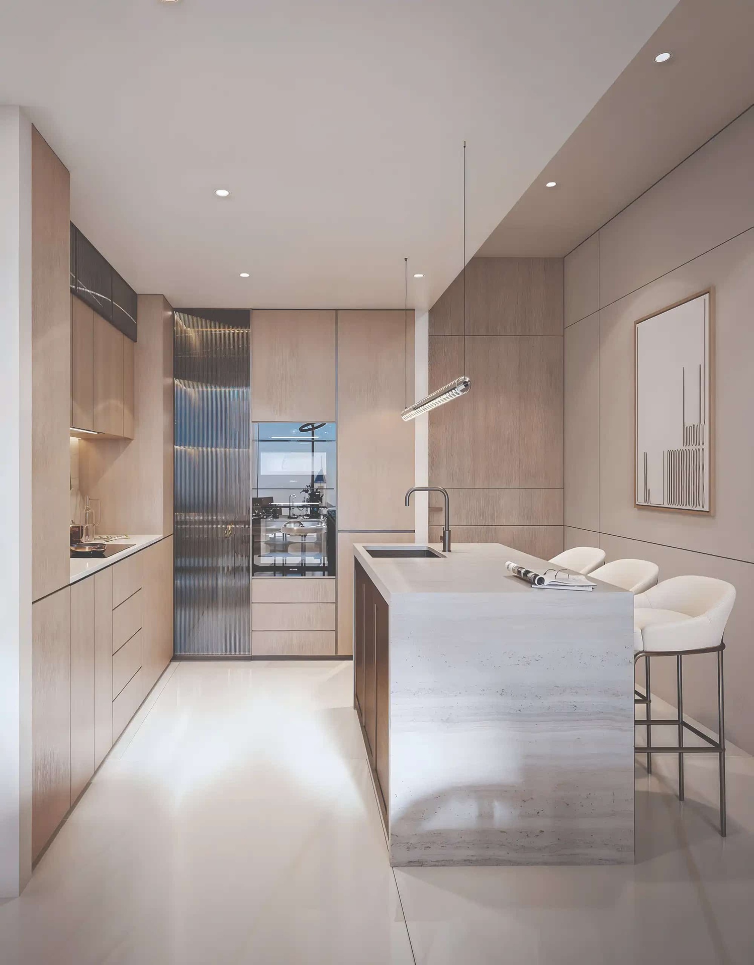 Samotný apartmán je navržen s důrazem na velkorysý prostor, přirozené světlo a plynulé propojení interiéru s exteriérem. Dispozice 3+kk nabízí otevřený obytný prostor zahrnující obývací pokoj, jídelní část a moderní kuchyni, které společně tvoří vzdušné srdce bytu. Velkoformátová okna umocňují pocit otevřenosti a zajišťují dostatek denního světla po celý den, zatímco navazující terasa rozšiřuje obytný prostor směrem ven a nabízí příjemné výhledy na mořskou hladinu, zeleň a okolní horizont. Hlavní ložnice disponuje vlastní koupelnou a dostatkem úložného prostoru, druhá ložnice je ideální jako pokoj pro hosty, dětský pokoj nebo reprezentativní pracovna. Interiéry jsou řešeny v nadčasovém, přirozeném stylu s důrazem na kvalitní materiály, funkčnost a dlouhodobou hodnotu.