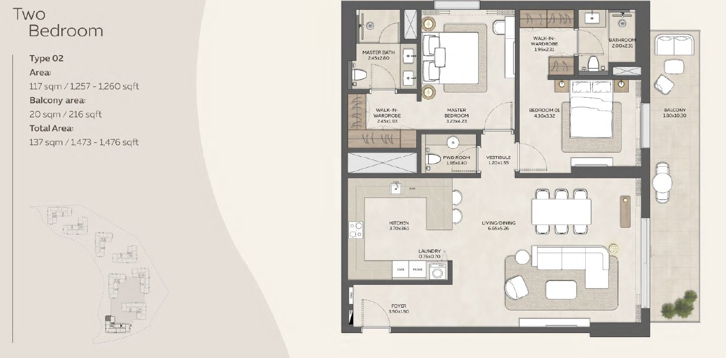 Apartmán má celkovou plochu přibližně 137 m², z toho obytná plocha 117 m² plus prostorný balkon 20 m². Dispozice zahrnuje prostornou master ložnici s walk-in šatnou a vlastní koupelnou, druhou ložnici, elegantní obývací část propojenou s jídelnou, plně vybavenou kuchyni, prádelnu, hostovskou toaletu a vstupní foyer – vše navrženo s maximálním důrazem na prostor, přirozené světlo a plynulé linie.