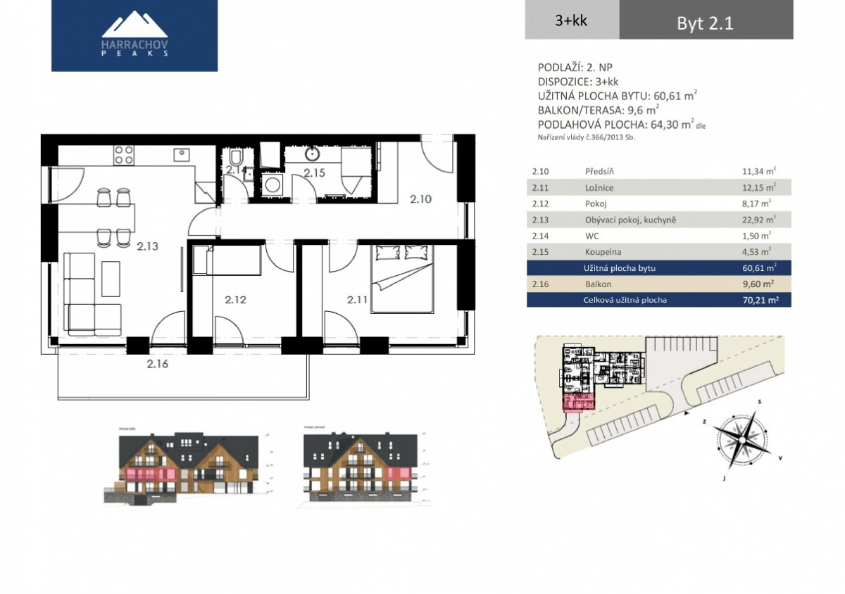 Nabízíme k prodeji apartmán o dispozici 3+kk, obytné ploše 60,6 m2 a podlahové ploše 64,3 m2 s balkonem 9,7 m2, který se nachází ve 2. nadzemním podlaží nově vznikajícího projektu HARRACHOV PEAKS.