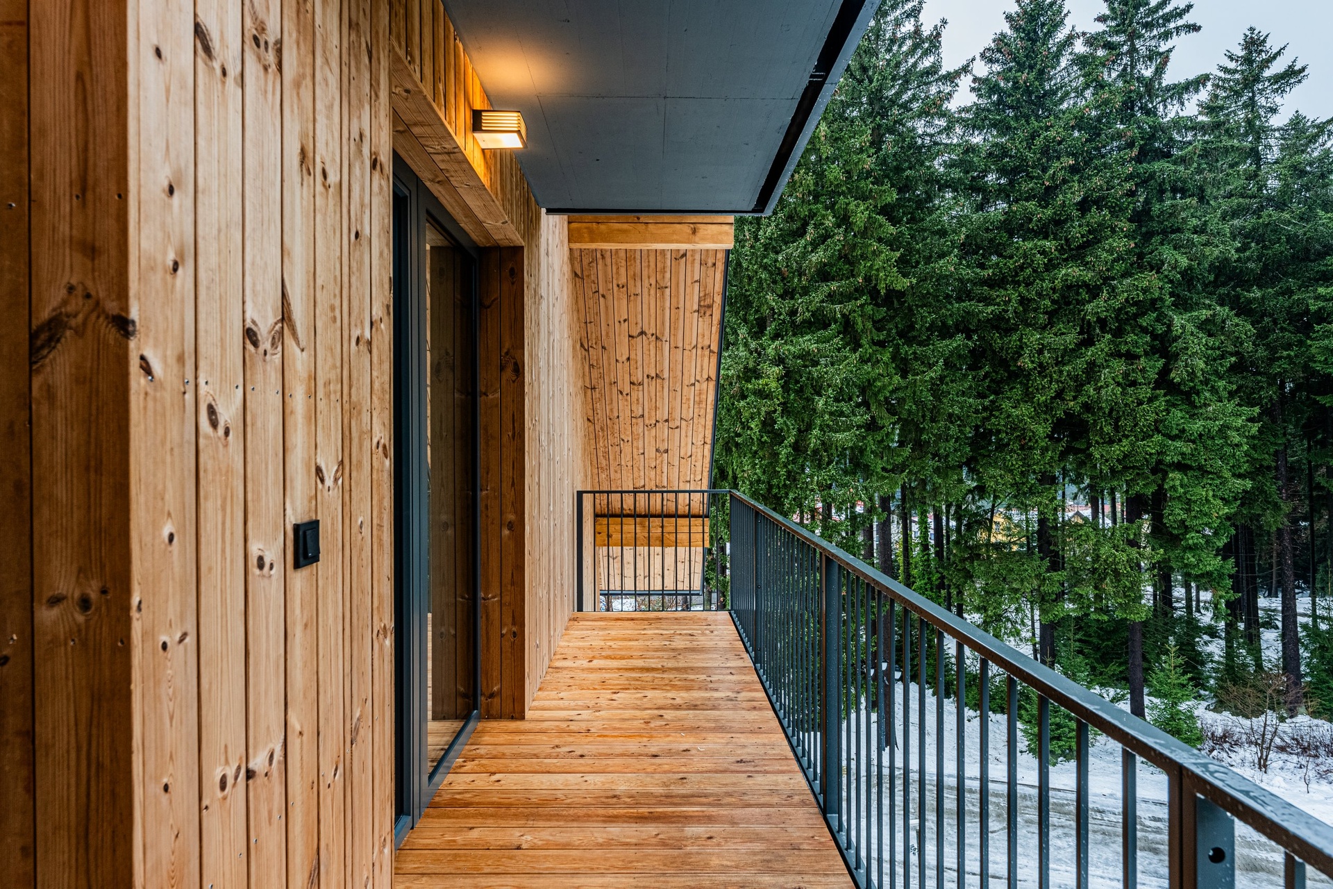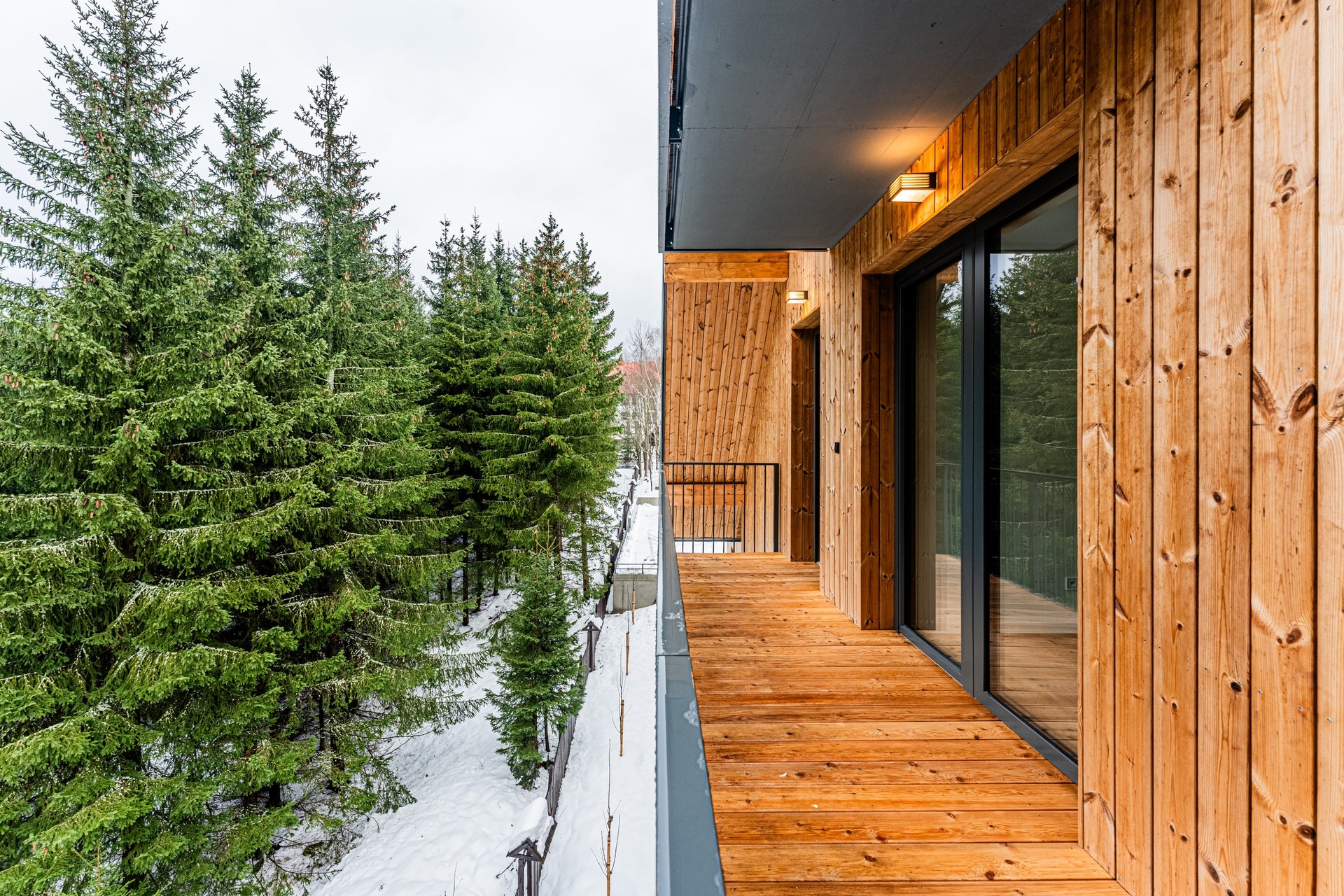 Harrachov Peaks je luxusní projekt vystavěný z kvalitních přírodních materiálů s wellness se saunou a vířivkou a plně vybaveným fitness. Představuje pouze 16 moderních apartmánů a nabízí tak komorní atmosféru v domě pro jejich majitele. Svým konceptem uspokojí zájemce jako o druhé bydlení v Krkonoších, tak investory se záměrem zajistit své finance nebo praktikovat výnosové krátkodobé pronájmy. Součástí nabídky je i správa apartmánů včetně pronájmů. Projekt HARRACHOV PEAKS nabízí vysoký standard vybavení – dubové podlahy, dřevěné terasy, velkoformátové obklady v koupelnách a na chodbách a další. Vytápění probíhá tepelnými čerpadly a je rozvedeno podlahovým topným systémem. V bytě je rekuperace. Energetická třída je velmi úspornou B.