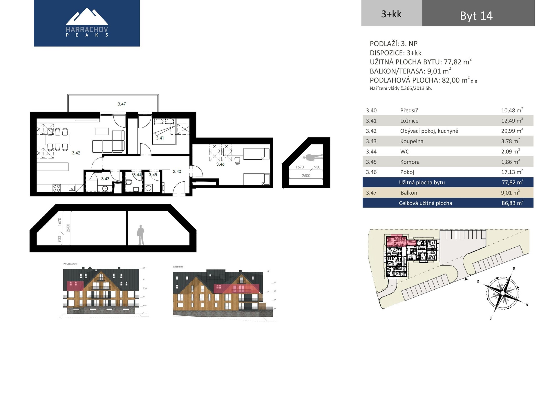 Nabízíme apartmán o dispozici 3+kk ve 3. NP luxusního projektu HARRACHOV PEAKS. Apartmán má obytnou plochu 77,8 m² (ve světlé podchozí výšce nad 1,2 m je to 74 m²) a celkovou užitnou plochu 86,83 m² se dvěma balkony (celkem 9,01 m²). Projekt je dokončen a zkolaudován a k dispozici je už vzorový byt. V suterénu je majitelům k dispozici wellness se saunou a vířivkou a vybavené fitness.