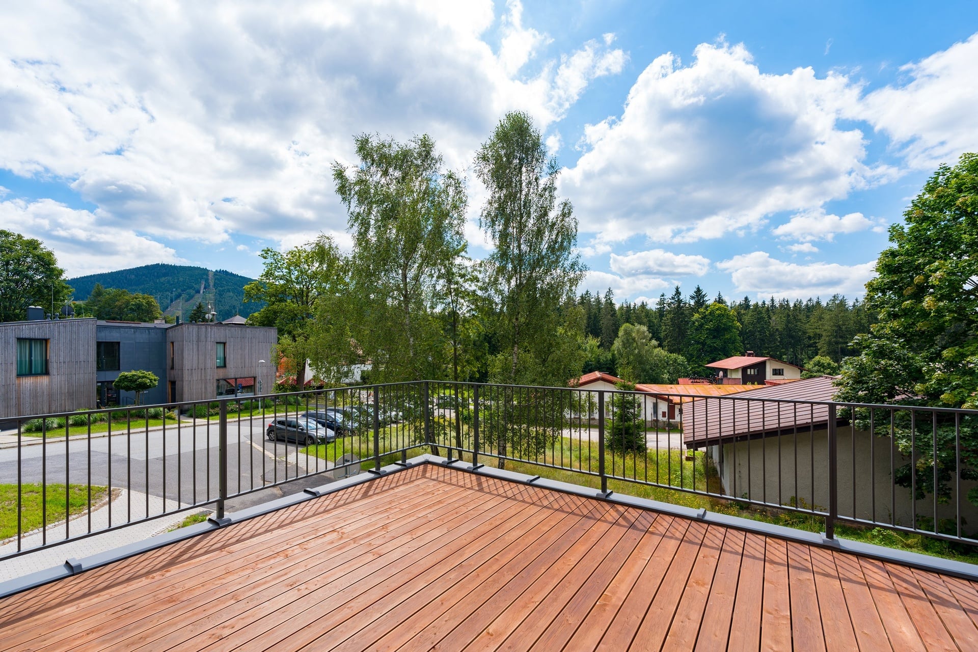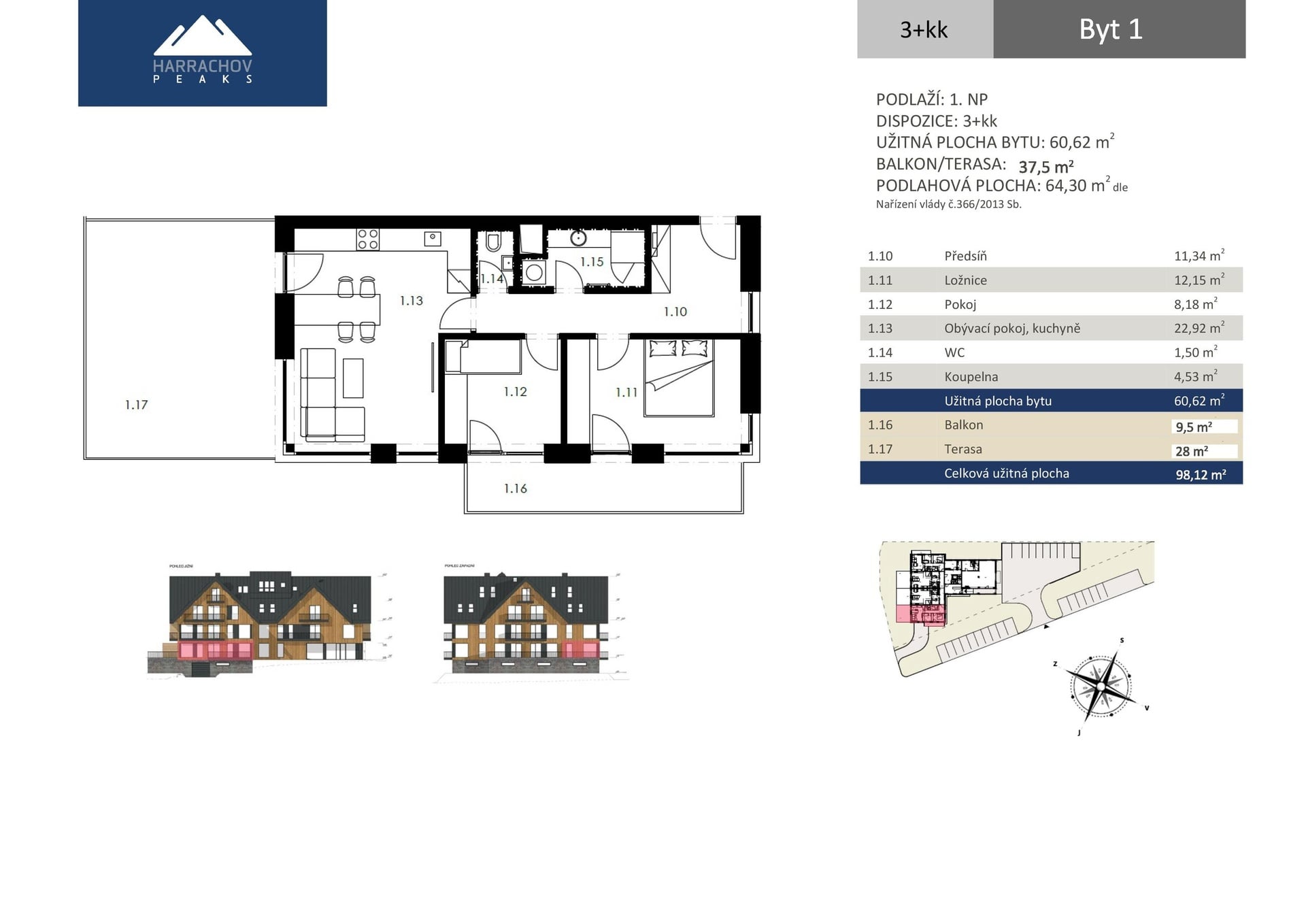 Nabízíme apartmán o dispozici 3+kk v 1.NP luxusního projektu HARRACHOV PEAKS. Apartmán má obytnou plochu 60,62 m² a celkovou užitnou plochu 98,12 m² vč. balkonu a terasy (36,78 m²). Projekt je dokončen a zkolaudován a k dispozici je už vzorový byt. V suterénu je majitelům k dispozici wellness se saunou a vířivkou a vybavené fitness.