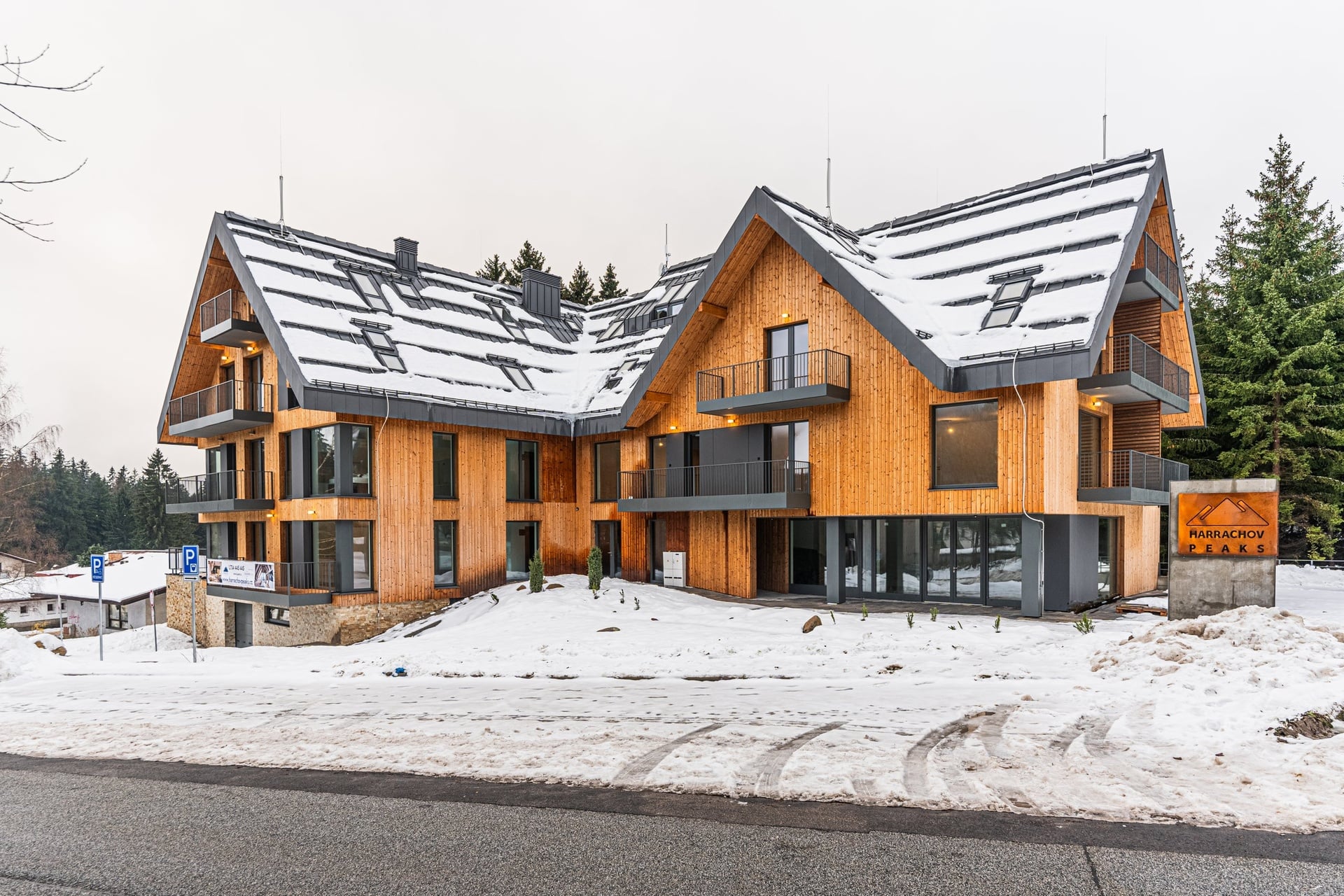 Harrachov Peaks je luxusní projekt vystavěný z kvalitních přírodních materiálů s wellness se saunou a vířivkou a plně vybaveným fitness. Představuje pouze 16 moderních apartmánů a nabízí tak komorní atmosféru v domě pro jejich majitele. Svým konceptem uspokojí zájemce jako o druhé bydlení v Krkonoších, tak investory se záměrem zajistit své finance nebo praktikovat výnosové krátkodobé pronájmy. Součástí nabídky je i správa apartmánů včetně pronájmů. Projekt HARRACHOV PEAKS nabízí vysoký standard vybavení – dubové podlahy, dřevěné terasy, velkoformátové obklady v koupelnách a na chodbách a další. Vytápění probíhá tepelnými čerpadly a je rozvedeno podlahovým topným systémem. V bytě je rekuperace. Energetická třída je velmi úspornou B.