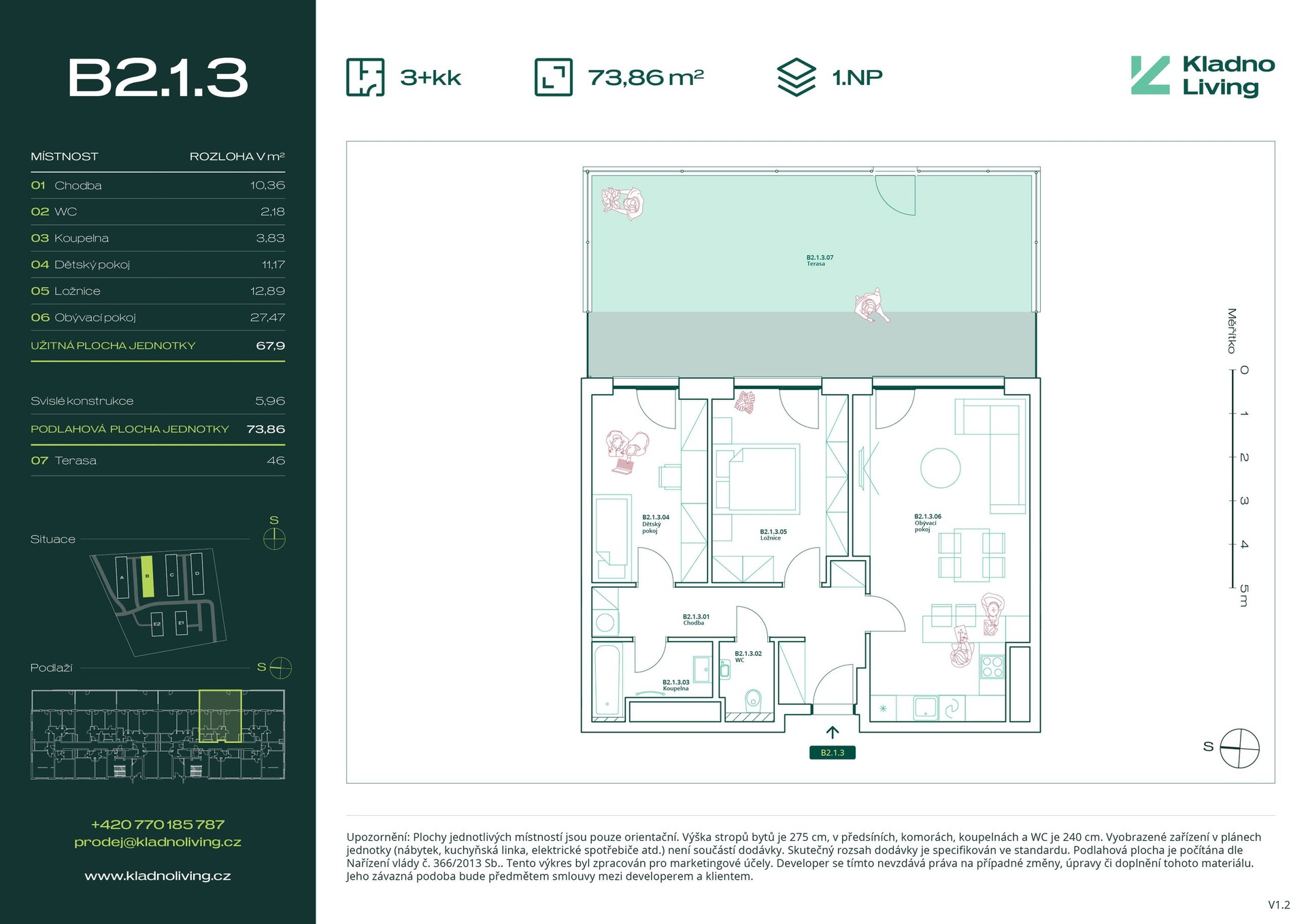 Nabízíme ke koupi moderní byt 3+kk o podlahové ploše 73,9 m² s terasou 46 m² v rezidenčním projektu Kladno Living, který vzniká v jedné z nejatraktivnějších lokalit města Kladno – Kročehlavy. Tento nový developerský projekt představuje jedinečnou příležitost pro ty, kteří hledají nové byty v Kladně nebo investici do nemovitosti s vysokým potenciálem zhodnocení.