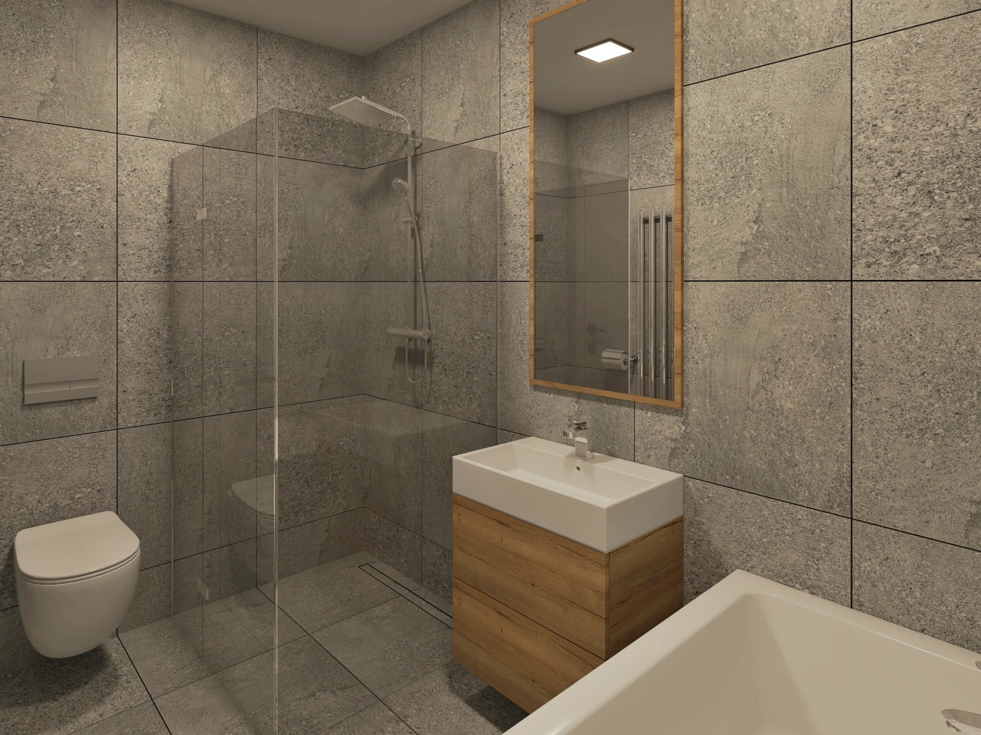 Byt o dispozici 3+kk a podlahové ploše 87,2 m2 se nachází ve třetím nadzemním podlaží budovy A a zahrnuje vstupní chodbu se vstupem na samostatnou toaletu a do koupelny se sprchovým koutem. Dále se zde nachází dvě ložnice a prostorný obývací pokoj s kuchyňským koutem a vstupem na lodžii (5,3 m2).