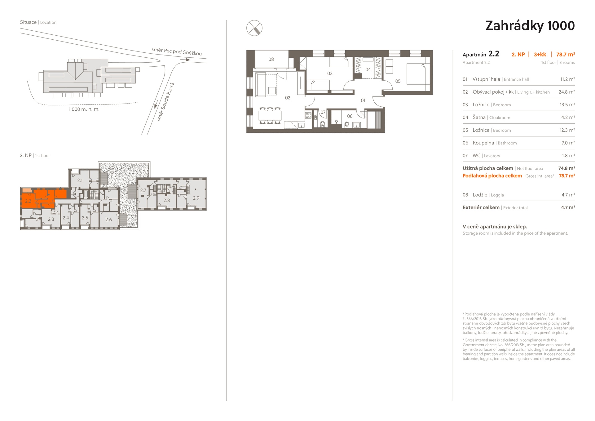 Nabízený apartmán má dispozici 3+kk a celkovou plochu 74,8 m2 s lodžií 4,7 m2. Nabízí dvě ložnice, obývací pokoj s prostupem na lodžii JV, koupelnu se sprchou a toaletou, samostatnou toaletu a chodbu s prostorem pro vestavěnou skříň. Orientace oken je na JV a JZ s výhledem na svah dolů s kopce směrem k Peci. K apartmánu náleží sklep.
