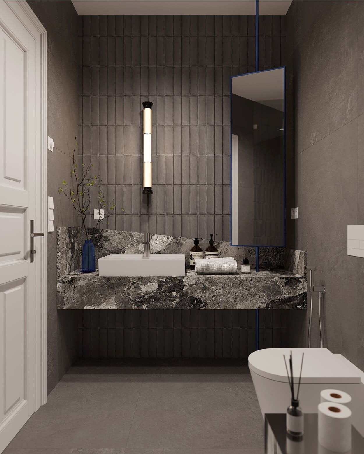 Koupelna je vybavena sanitou LAUFEN KARTELL, keramické obklady a dlažby EMIL CERAMICA v moderních odstínech dodávají koupelně nadčasový vzhled.