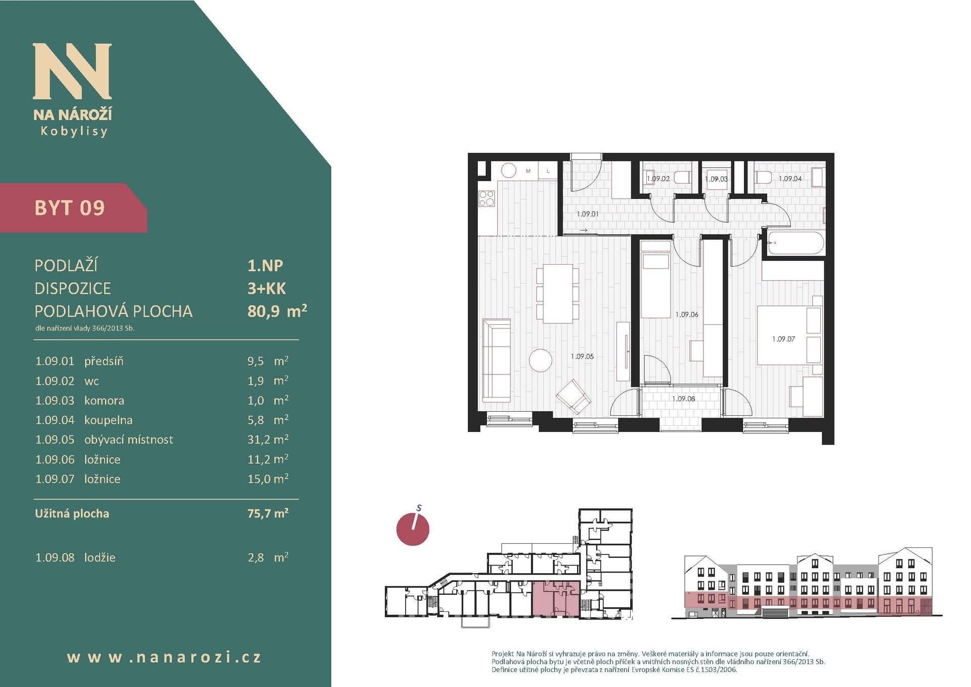 Tento byt 3+kk vznikne v projektu Na Nároží v pražských Kobylisích v 1.NP moderního bytového domu v pěší dostupnosti metra. Podlahová plocha bytu je 80,9 m², celková plocha bytu včetně lodžie (2,8 m²) činí 78,5 m². K bytu náleží sklep, který je započten v ceně.