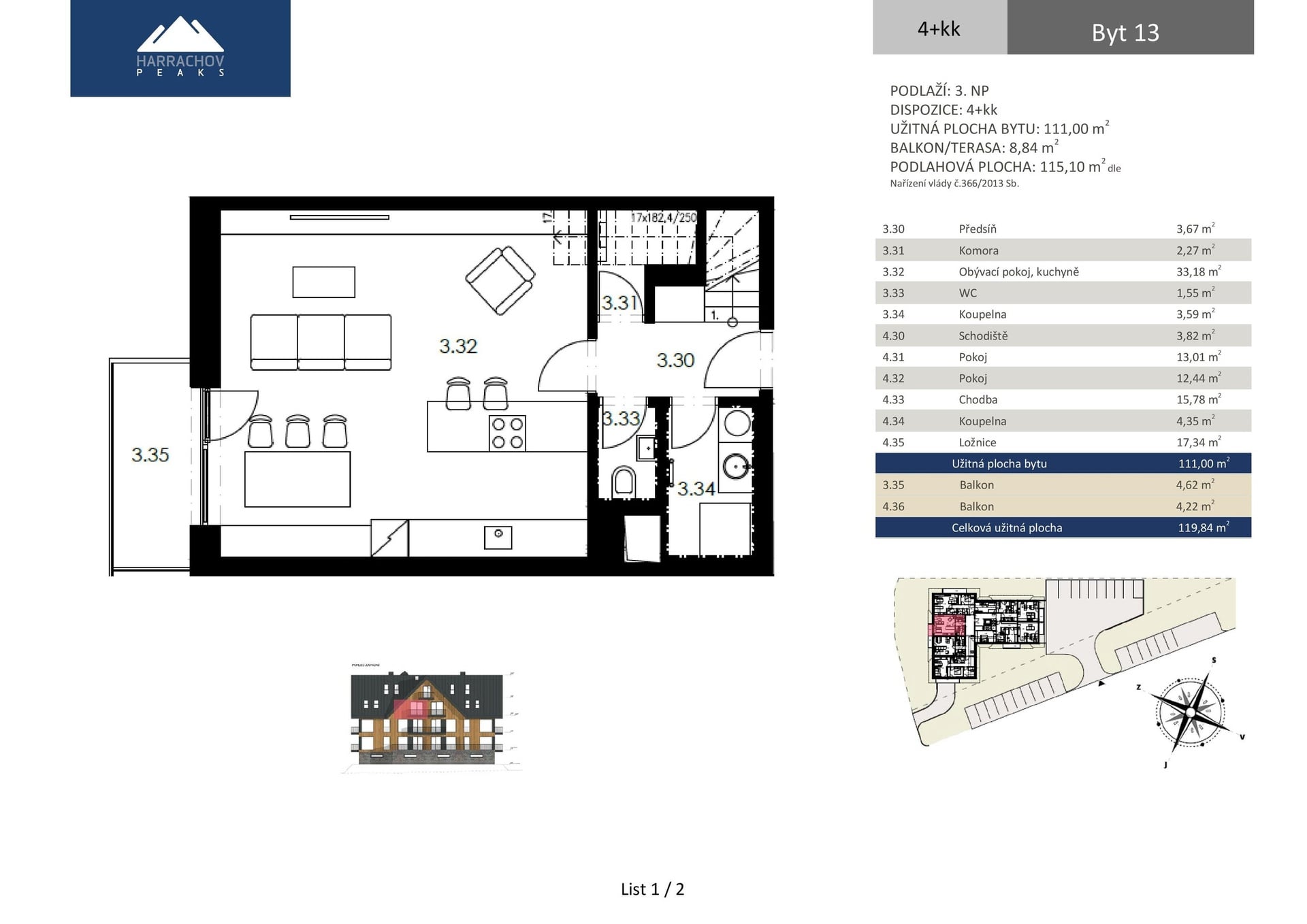 Nabízíme apartmán o dispozici 4+kk ve 3. a 4.NP luxusního projektu HARRACHOV PEAKS. Apartmán má obytnou plochu 115,1 m² (ve světlé odchozí výšce nad 1,2 m je to 109 m²) a celkovou užitnou plochu 119,84 m² se dvěma balkony (celkem 8,84 m²). Projekt je dokončen a zkolaudován a k dispozici je už vzorový byt. V suterénu je majitelům k dispozici wellness se saunou a vířivkou a vybavené fitness.